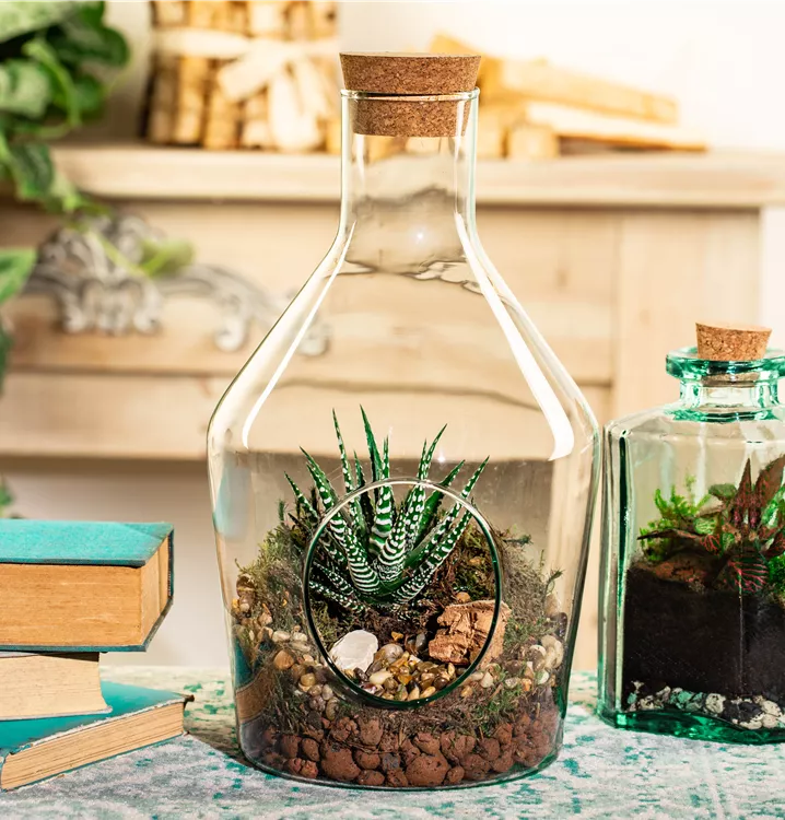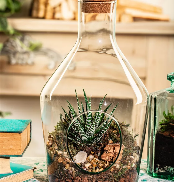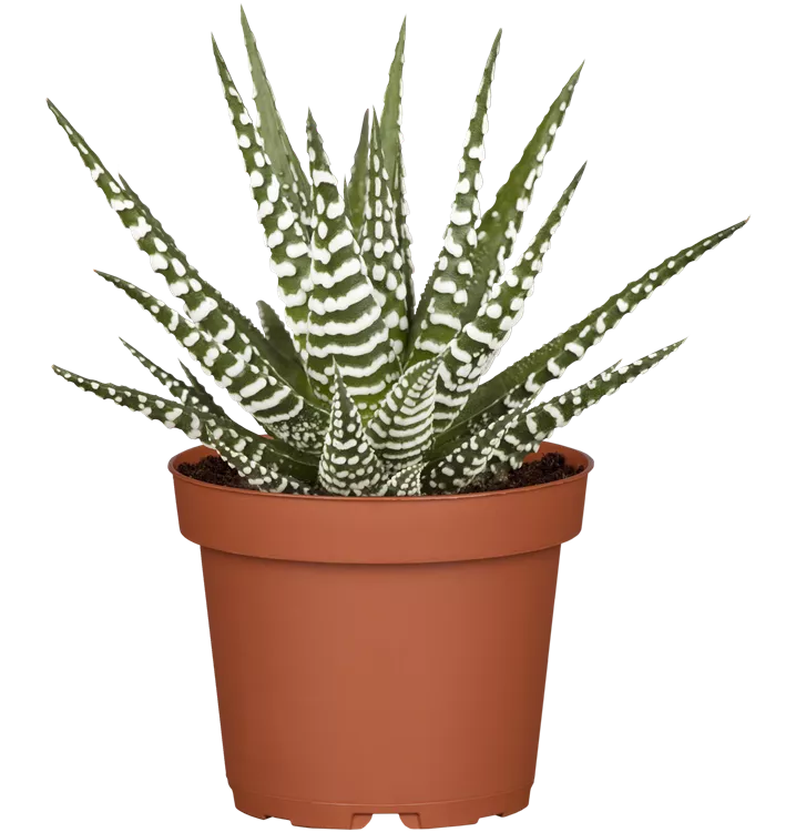 Die Haworthie (Haworthia fasciata) ist eine Pflanze mit grün-weißen, lanzettlichen, gezähnten Blättern. Ihre röhrenförmigen Blüten sind cremeweiß und erscheinen in Ähren von Januar bis Dezember. Diese rosettenartige und sukkulente Pflanze gedeiht am besten an einem sonnigen Standort.