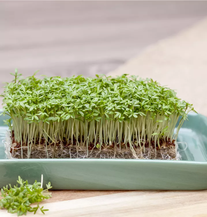 Die Gartenkresse (Lepidium sativum) ist eine Kräuterpflanze mit einem nussigen, scharfen Geschmack. Ihre mittelgrünen Blätter sind lanzettlich und gebuchtet. Für das optimale Wachstum der Gartenkresse werden ein sonniger Standort und durchlässiger, nährstoffreicher Boden benötigt.