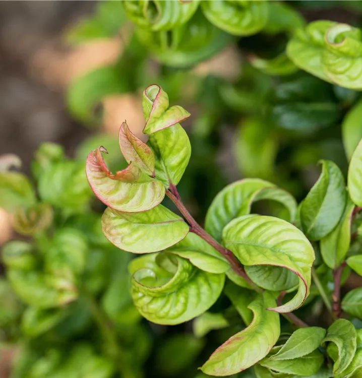 Die immergrünen Blätter der Traubenheide 'Curly Red'® sind dunkelgrün, lanzettlich, glänzend, wechselständig, gezähnt. Roter Austrieb. Mit seinem purpurroten Laub setzt sie schöne Akzente im Winter.
