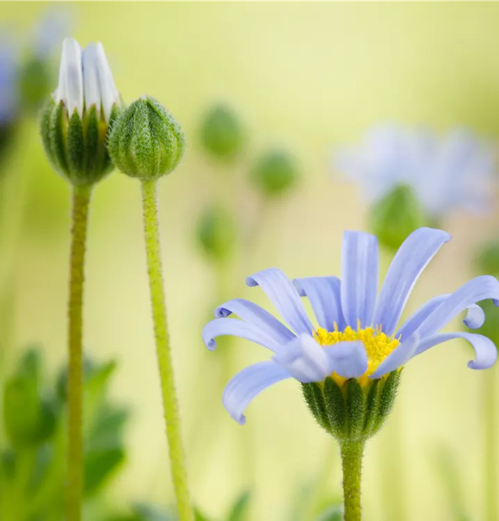 Die blauen, weißen, rosafarbenen, körbchenartigen Blüten erscheinen von Juni bis Oktober.