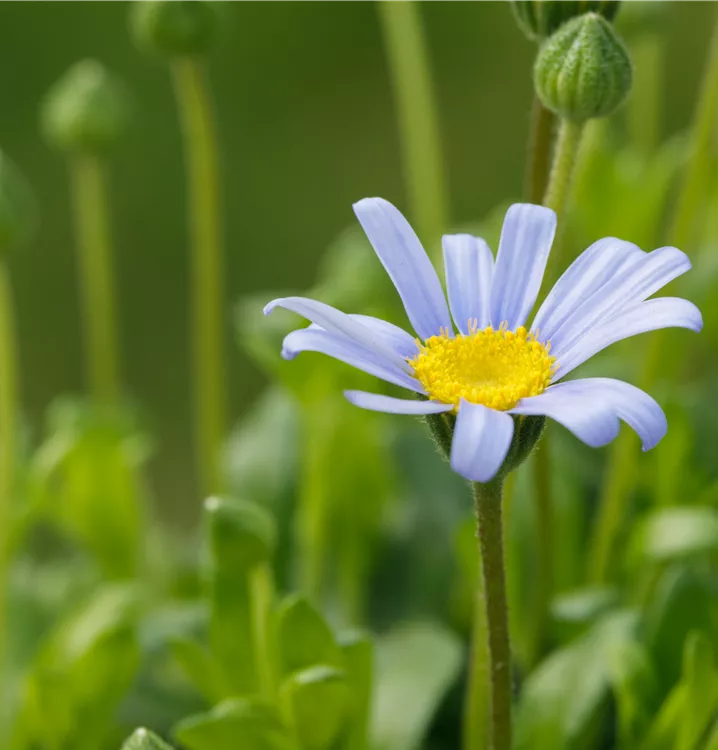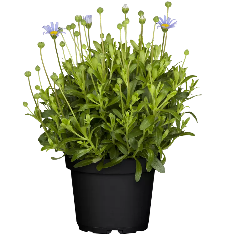 Die Blaue Kapaster (Felicia amelloides) ist eine beliebte Pflanze für den Balkon, die während der gesamten Saison unzählige blaue, weiße oder rosafarbene Blüten bildet. Die mittelgrünen Blätter sind lanzettlich. Ein sonniger Standort und ein durchlässiges Substrat werden bevorzugt.