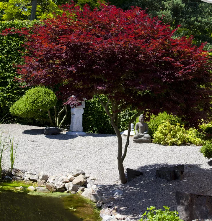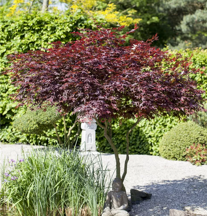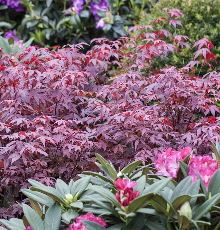 Der Rote Fächerahorn 'Atropurpureum' (Acer palmatum) ist ein ausladender, breiter, malerischer, sommergrüner Großstrauch mit dekorativen, tief geschlitzten, purpurroten Blättern. Zudem trägt er im Mai purpurrote, in Trauben angeordnete Blüten. Aus diesen gehen rot-braune Flügelfrüchte hervor. An einem sonnigen bis halbschattigen, windgeschützten Standort mit durchlässigem, nährstoffreichem Boden erreicht er gewöhnlich eine Höhe von ca. 4 m und wird ca. 4 m breit.
