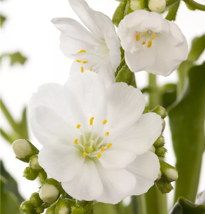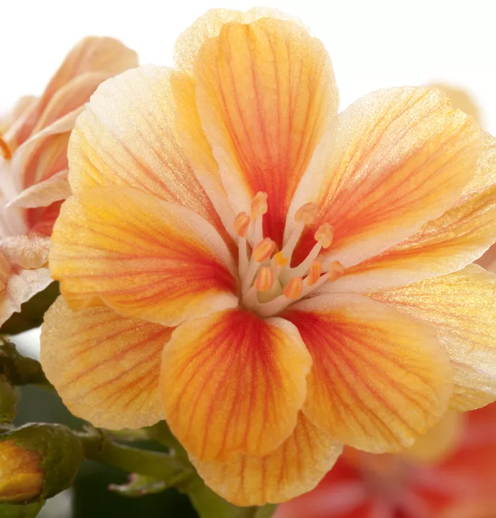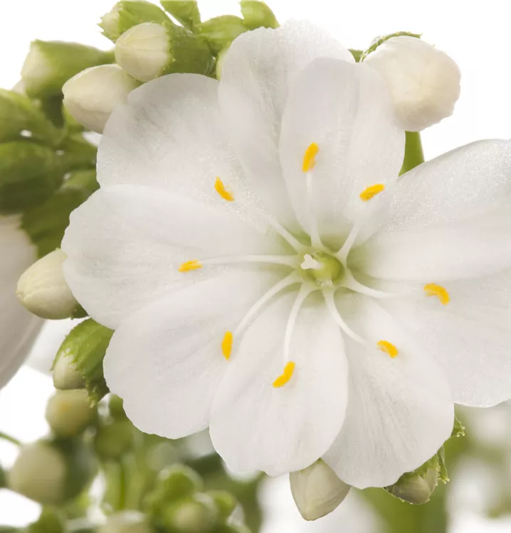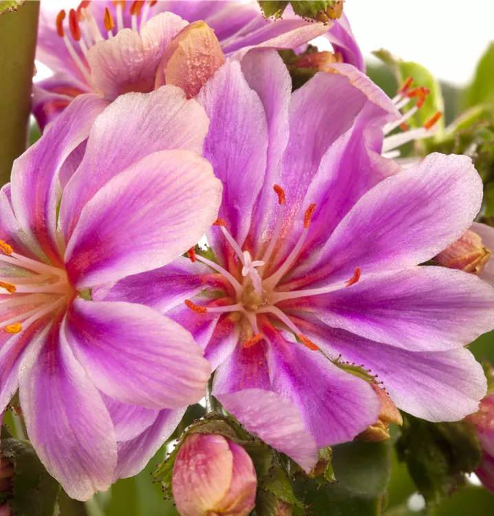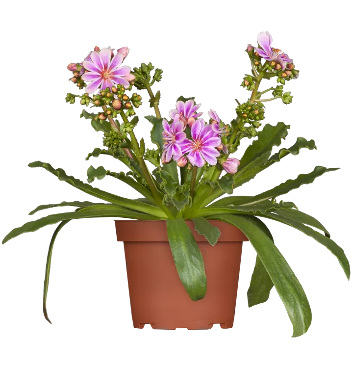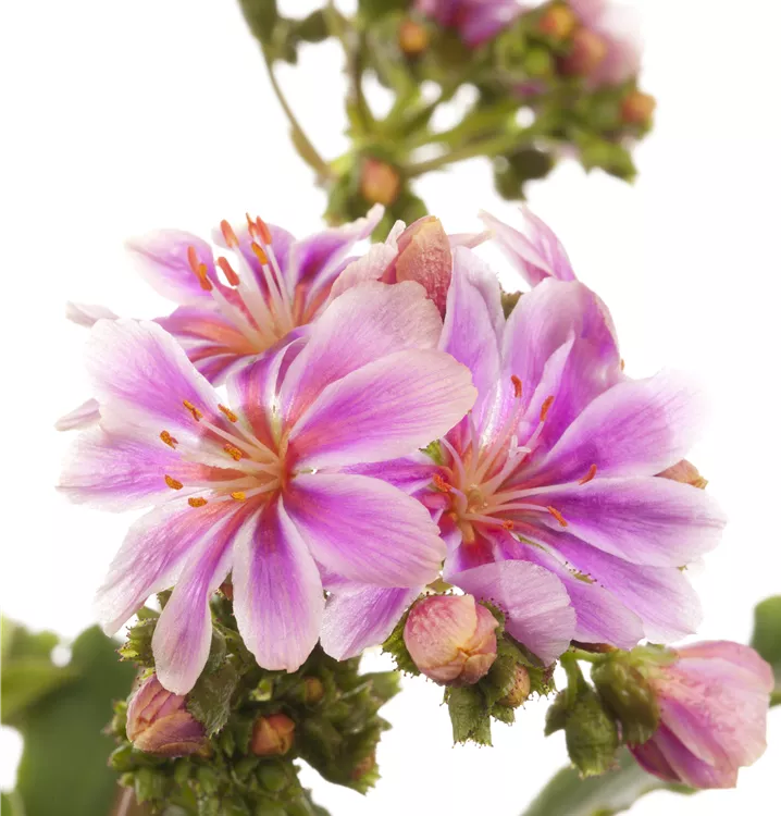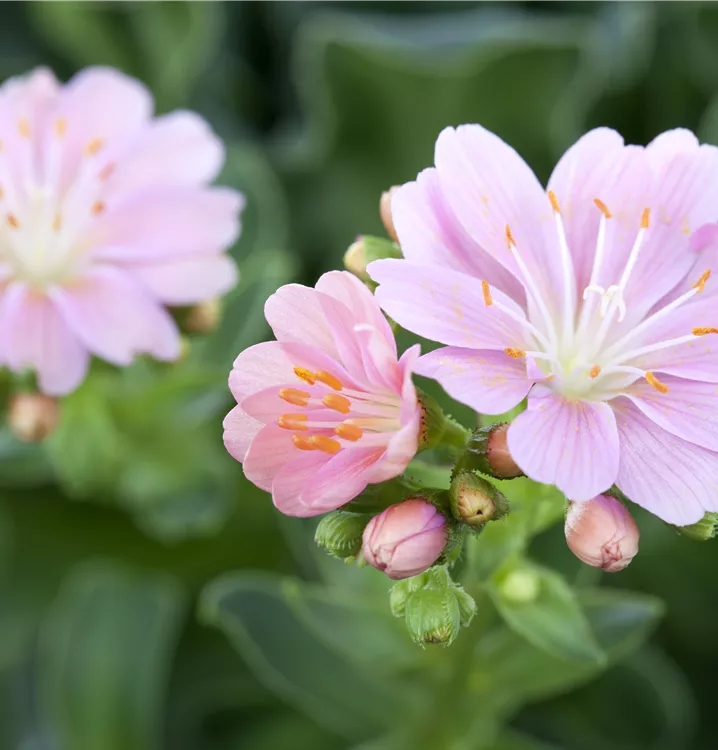 Lewisia cotyledon bildet schalenförmige, rosafarbene Blüten ab Mai.