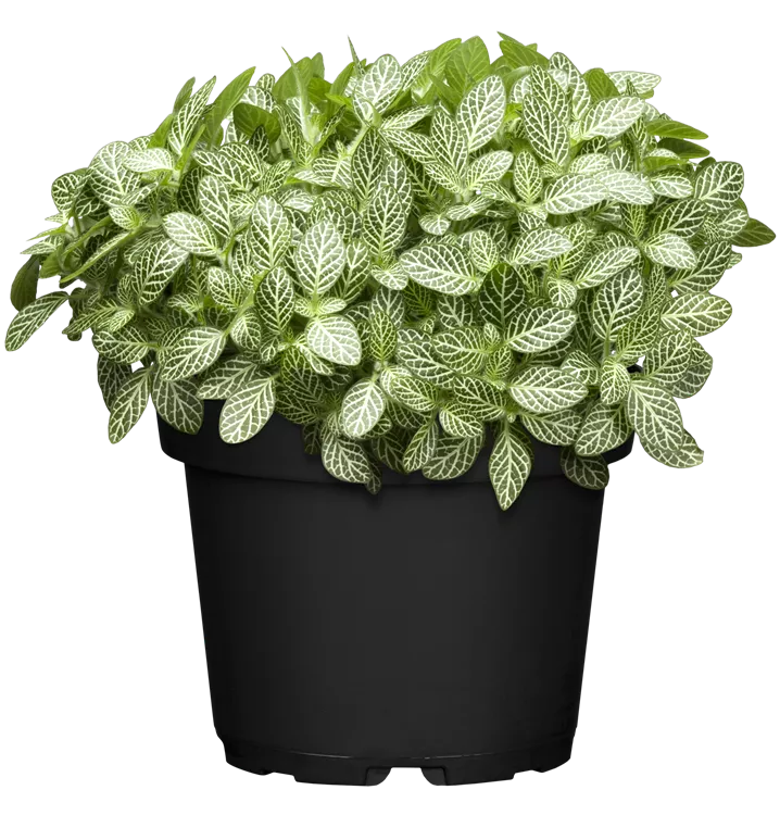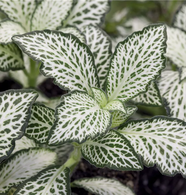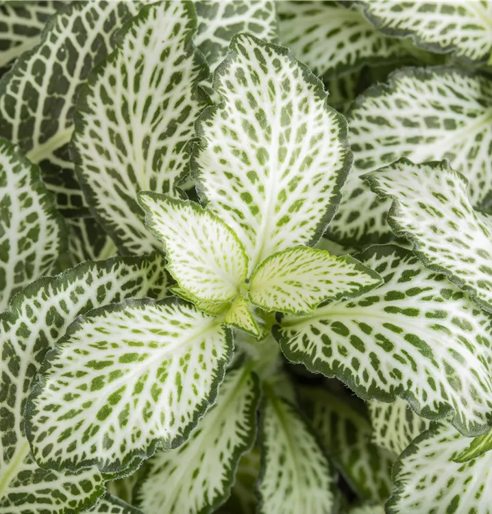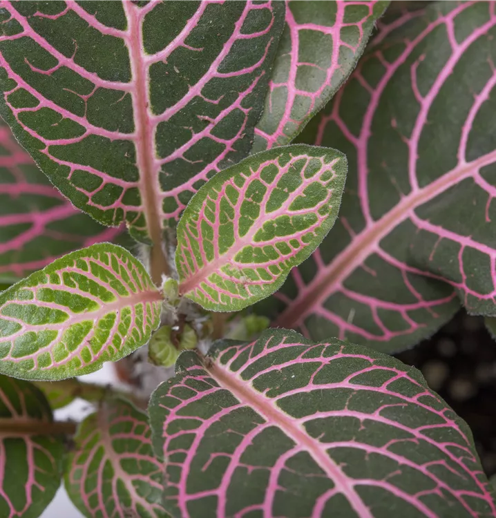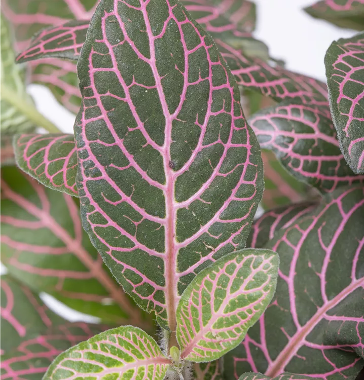 Hoher Blattschmuckwert. Die Blätter der Fittonie sind mehrfarbig, eiförmig.