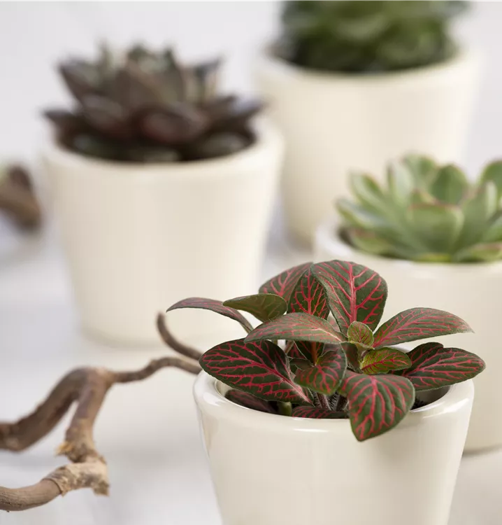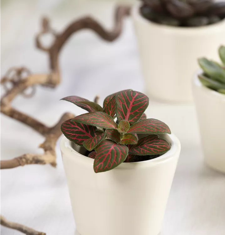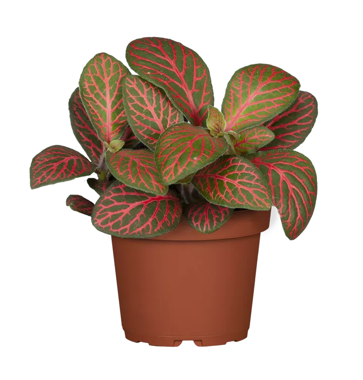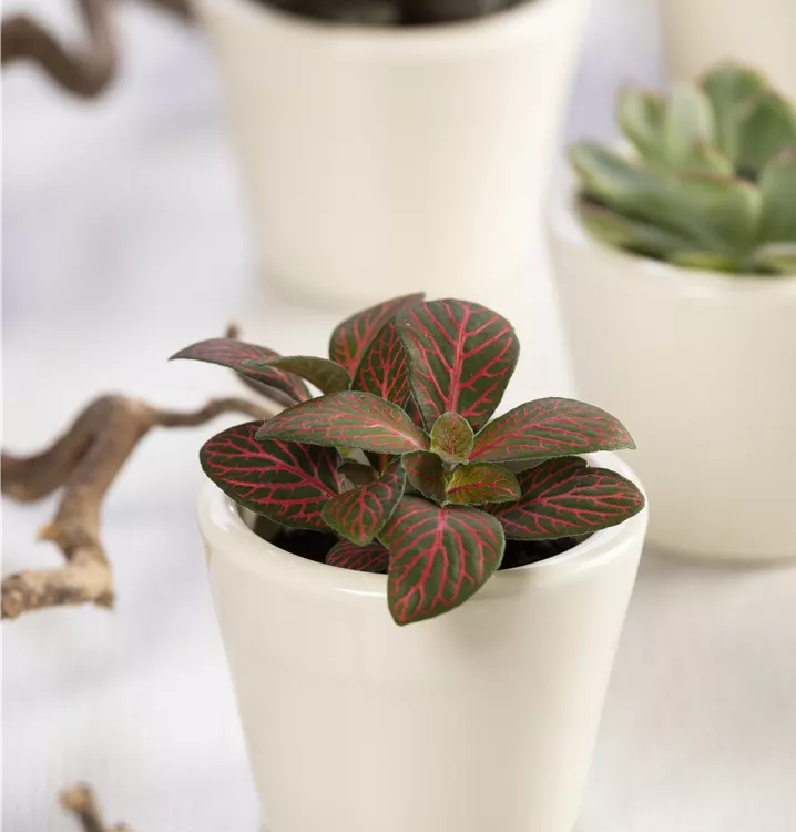 Die Fittonie (Fittonia verschaffeltii) ist eine Pflanze mit dekorativen, mehrfarbigen Blättern. Sie sind eiförmig. Diese überhängende Pflanze gedeiht am besten an einem hellen Standort.