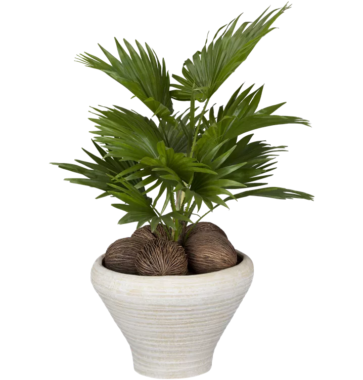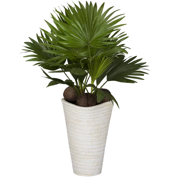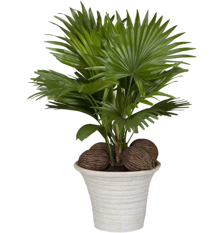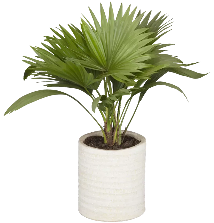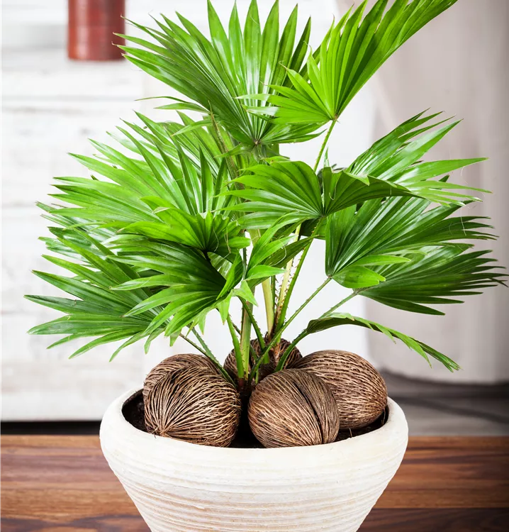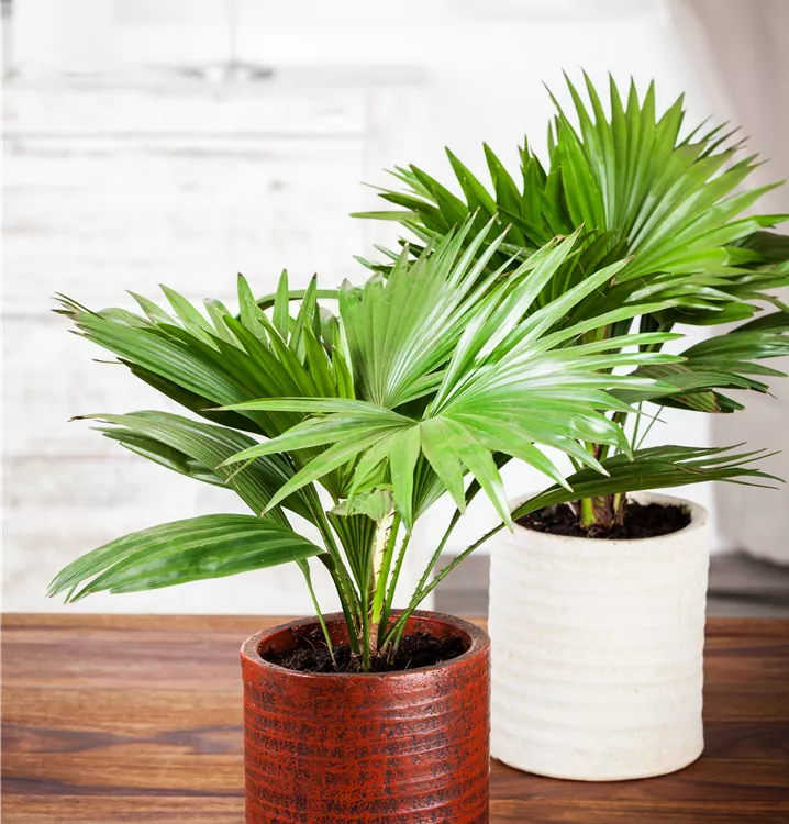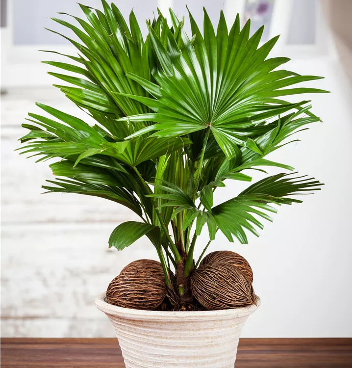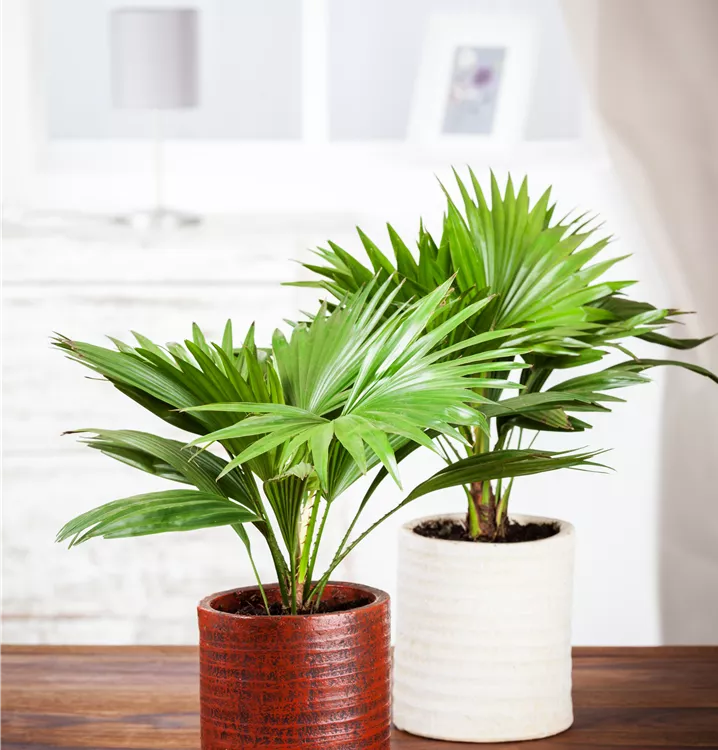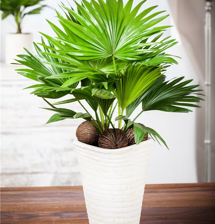Die Chinesische Livingstonpalme (Livistona chinensis) ist eine sehr beliebte Kübelpflanze. Die mittelgrünen Blätter sind tief geschlitzt. Der Standort sollte möglichst sonnig bis halbschattig sein. Eine durchlässige Erde ist dabei ideal. Bei günstigen Bedingungen erreicht die Chinesische Livingstonpalme eine Höhe von ca. 1,5 m und wird bis zu 1 m breit.