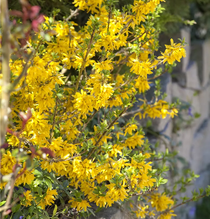 Die Forsythie (Forsythia x intermedia) ist ein breiter Strauch, der gelbe, in Rispen angeordnete Blüten hervorbringt. Sie erscheinen von März bis Mai. Zudem trägt die Forsythie, lanzettliche, mittelgrüne Blätter. An einem sonnigen bis halbschattigen Standort mit durchlässigem, nährstoffreichem Boden erreicht sie gewöhnlich eine Höhe von ca. 3,5 m und wird ca. 3 m breit.