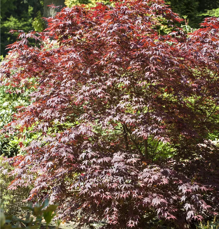 Fächerahorn 'Bloodgood' ist ein breit, rundlich wachsender, malerischer Großstrauch. Er erreicht gewöhnlich eine Höhe von 4 - 6 m und wird ca. 4 - 6 m breit. In der Regel wächst er 10 - 20 cm pro Jahr.