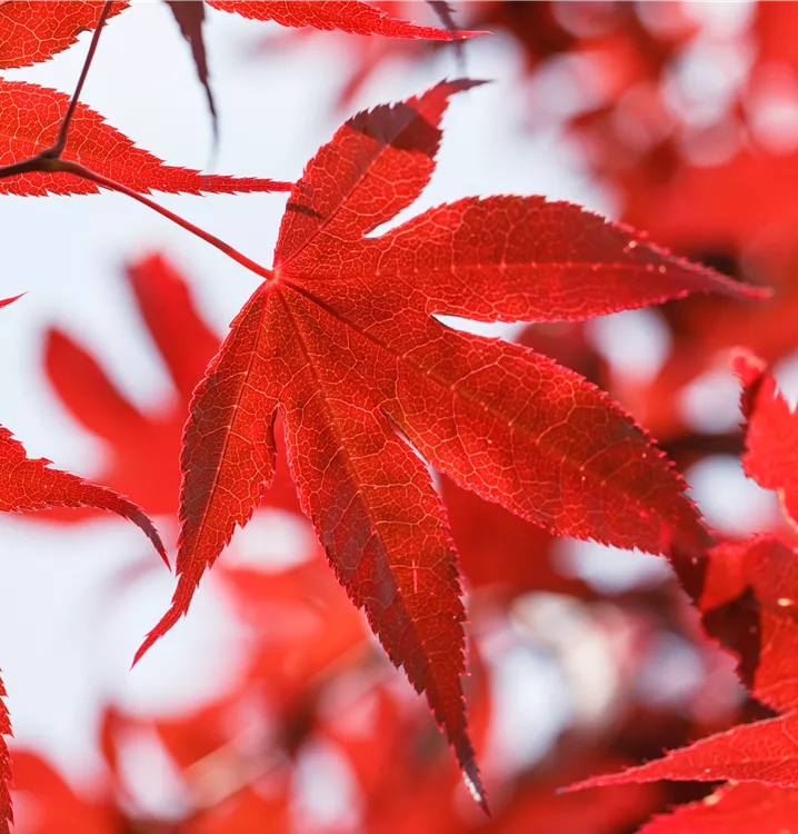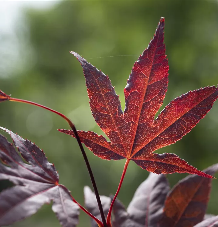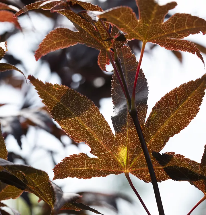 Hoher Blattschmuckwert. Die sommergrünen Blätter des Fächerahorns 'Bloodgood' sind dunkelrot, gegenständig, gelappt. Diese sind etwa 5 - 10 cm groß. Fächerahorn 'Bloodgood' zeigt sich leuchtend scharlachrot im Herbst.