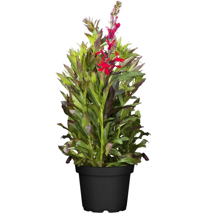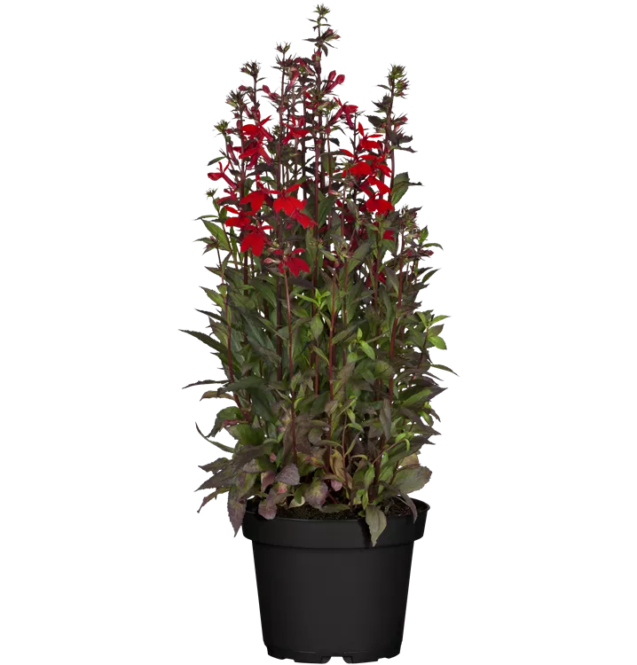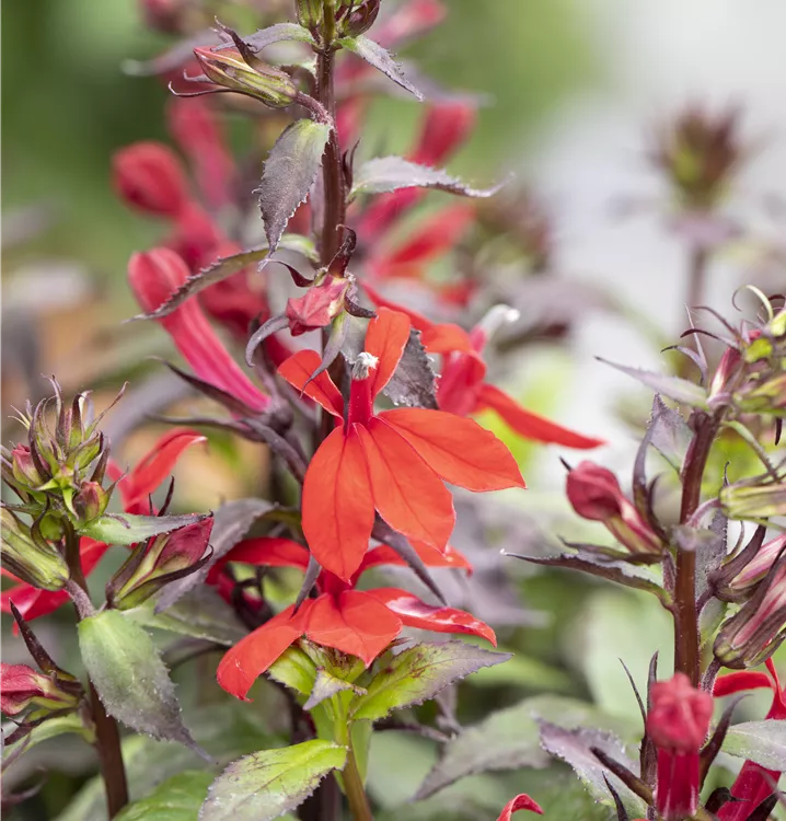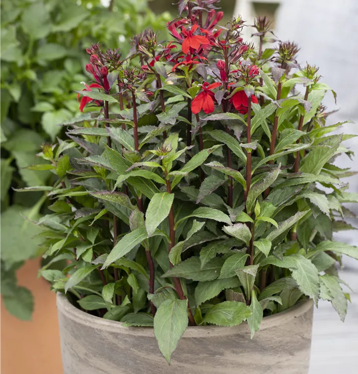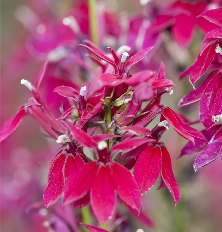 Lobelia x speciosa bildet rote, purpurrote, violette Blüten ab August.