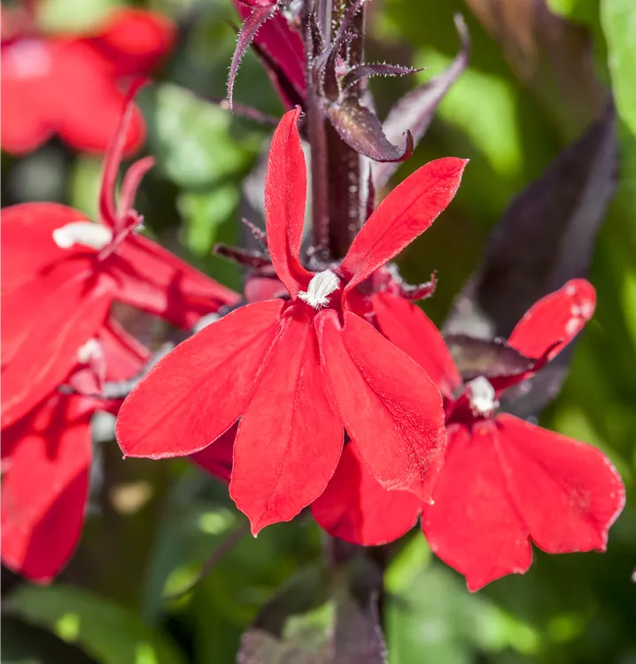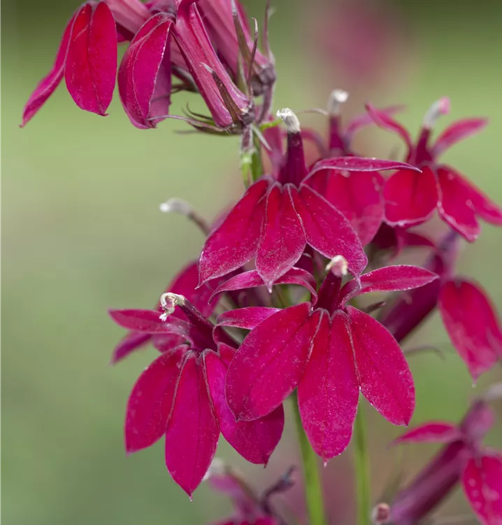Die Lobelie (Lobelia x speciosa) ist eine aufrechte Staude, die von August bis September rote, purpurrote oder violette Blüten bildet. Ihre lanzettlichen, Blätter sind mittelgrün. An einem sonnigen bis halbschattigen Standort mit durchlässigem, nährstoffreichem Boden erreicht sie gewöhnlich eine Höhe von ca. 1,2 m und wird ca. 80 cm breit. Die Lobelie ist gut frostverträglich.