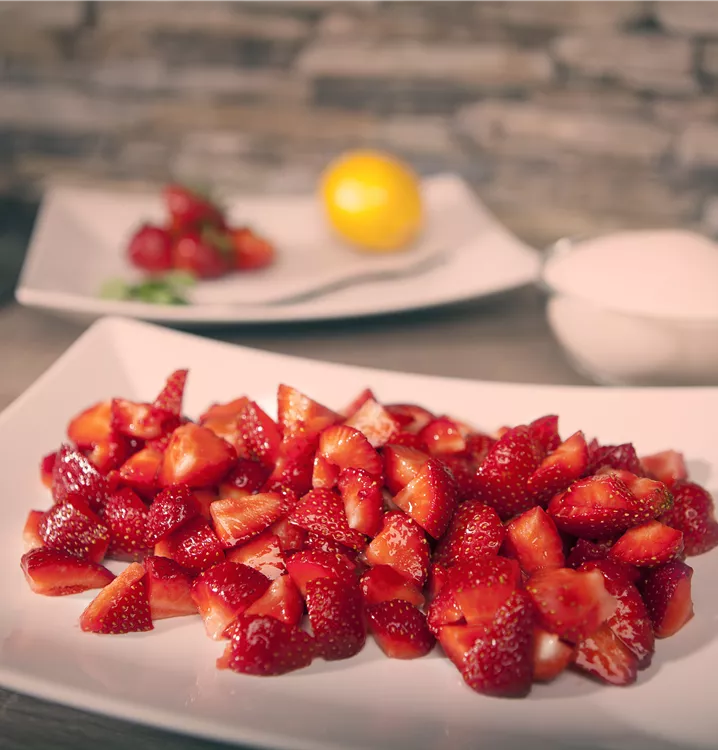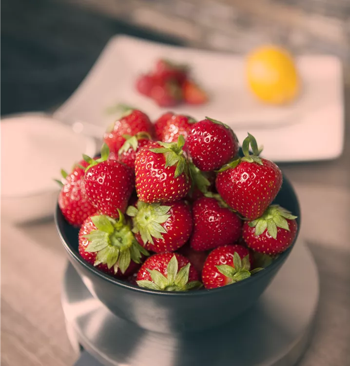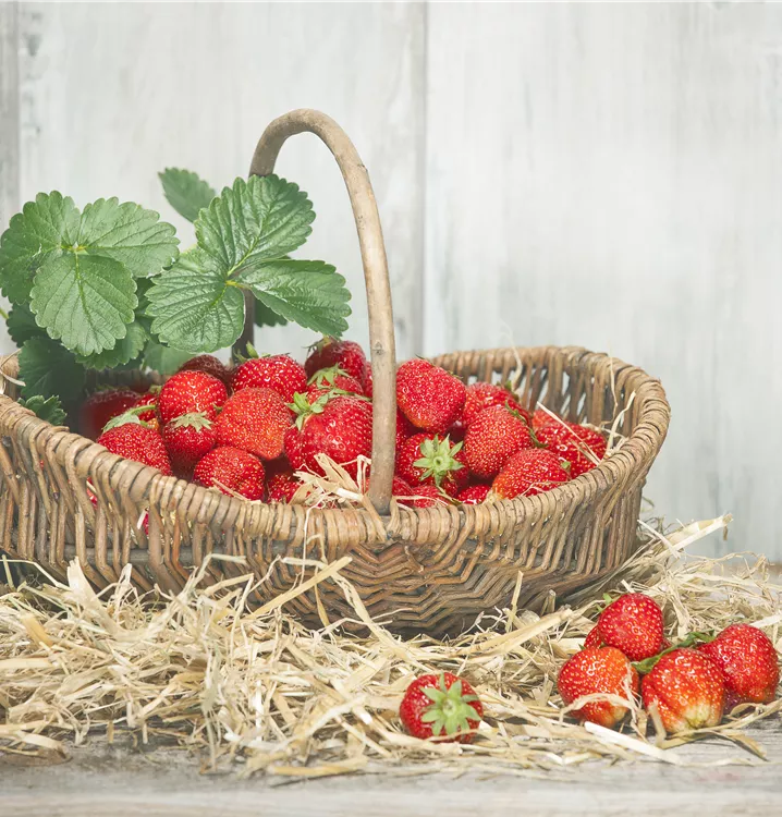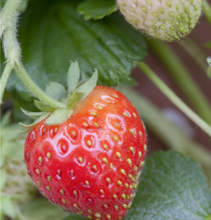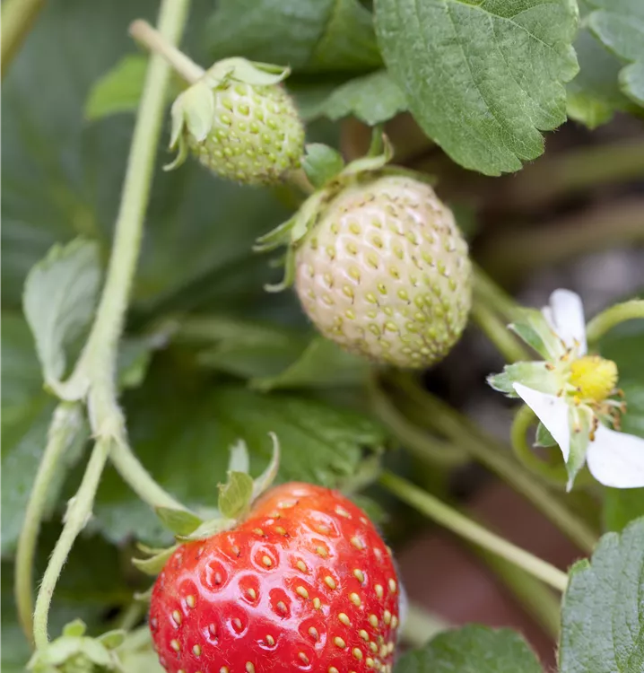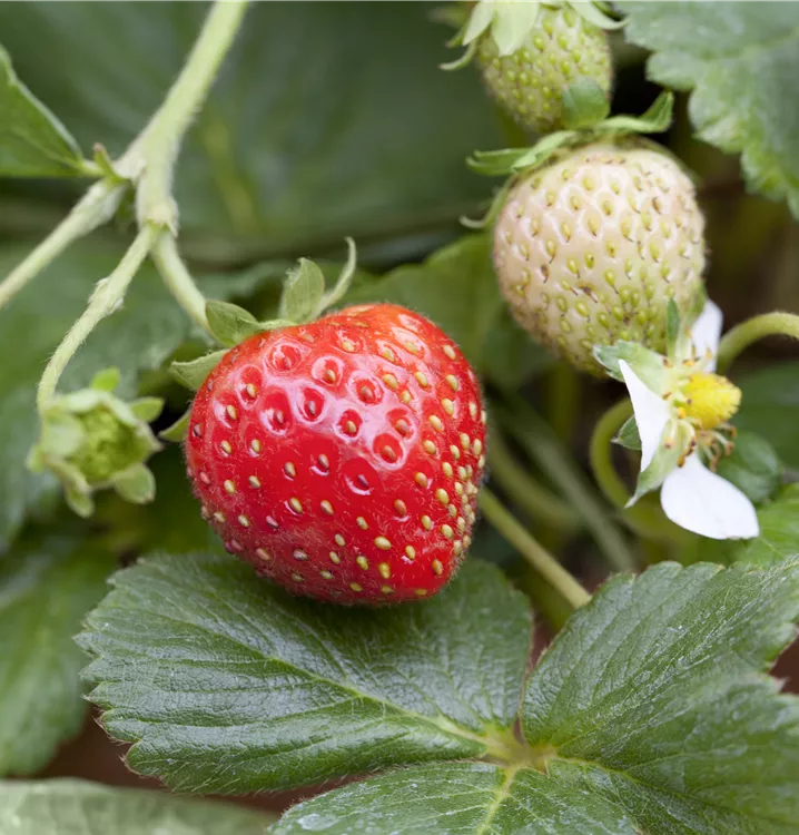 Die Garten-Erdbeere (Fragaria x ananassa) bildet rote Beeren. Diese sind süß, fruchtig im Geschmack. Für eine ertragreiche Ernte ab Mai schaffen durchlässiger, humoser, schwachsaurer Boden und ein sonniger Standort optimale Bedingungen. Ihre weißen Blüten sind eine schöne Erscheinung. Die Garten-Erdbeere wird mit ihrem ausläuferbildenden Wuchs etwa 20 cm hoch und 30 cm breit, dadurch kann sie hervorragend in Töpfen auf Balkon oder Terrasse angebaut werden.