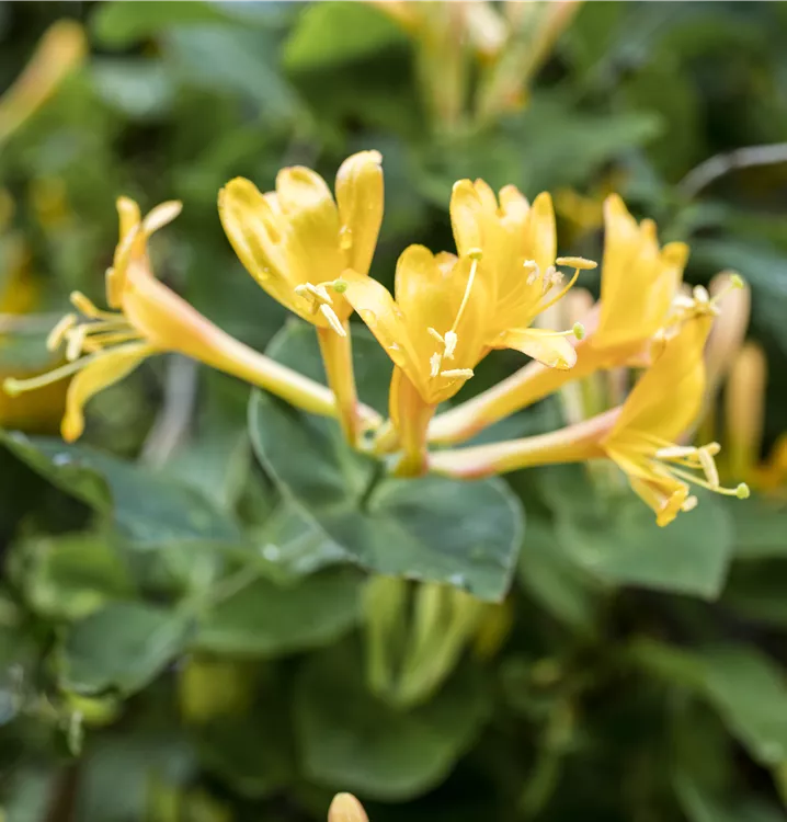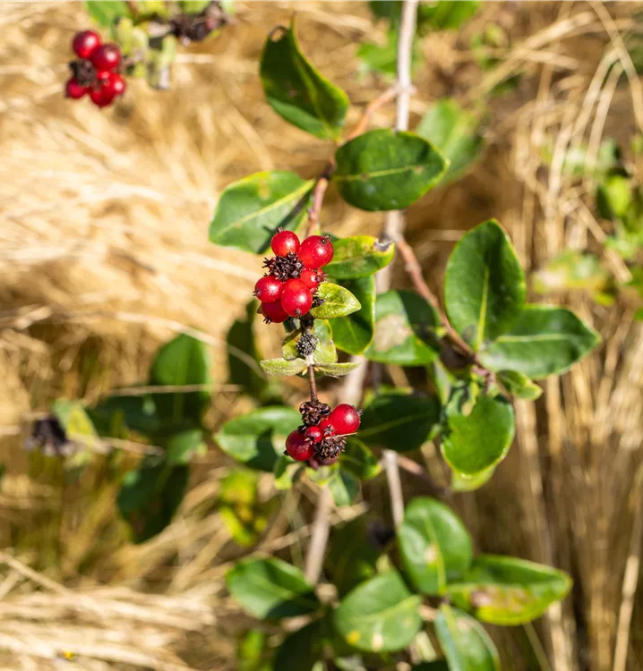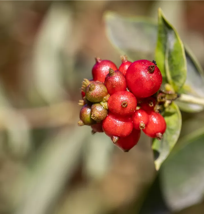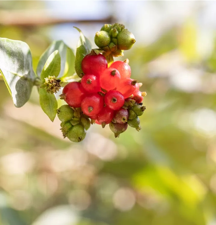 Besonders dekorativ sind die roten Früchte von Lonicera heckrottii.