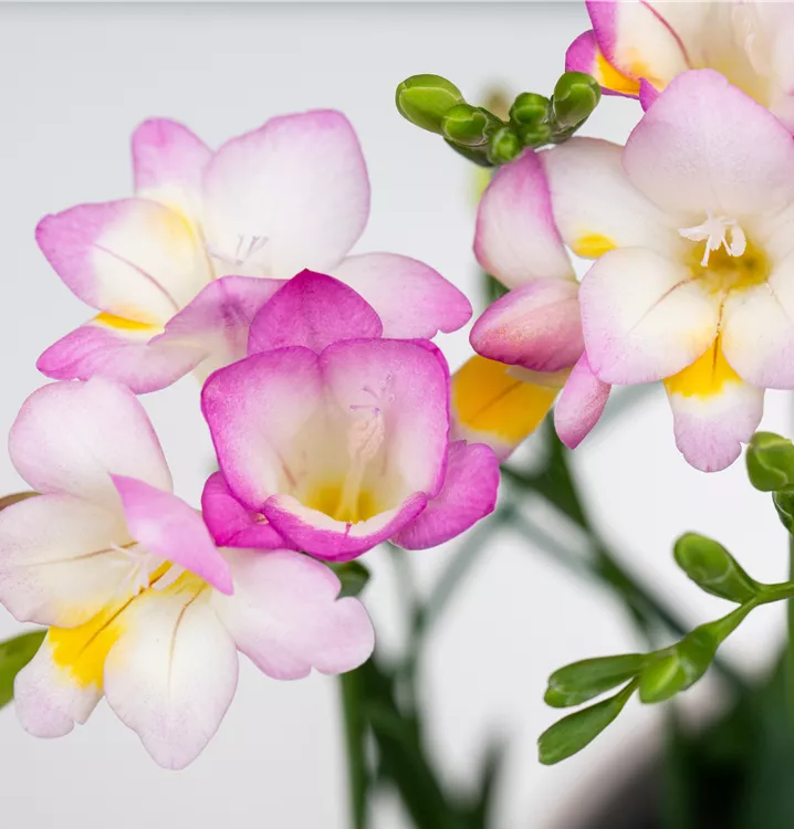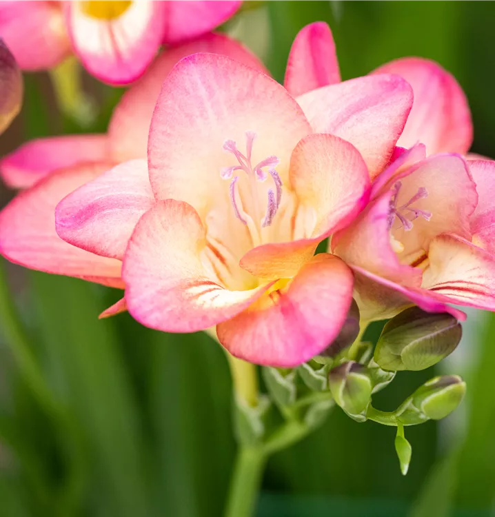 Die Freesie (Freesia) bringt ansehnliche, gelbe, lilafarbene, rosafarbene, rote, violette, weiße, angenehm duftende Blüten von Juli bis August hervor. Bevorzugt wird ein durchlässiger, lockerer, sandiger Boden in sonniger Lage. Die aufrechte Pflanze erreicht gewöhnlich eine Höhe von 20 - 40 cm und wird bis zu 10 cm breit.
