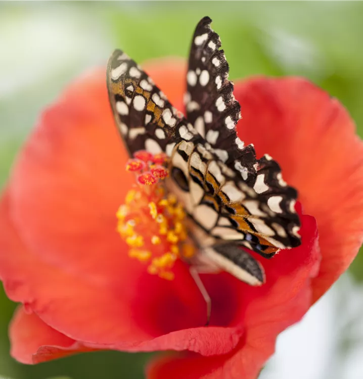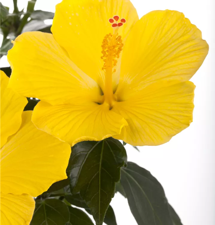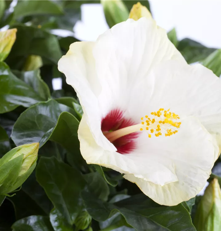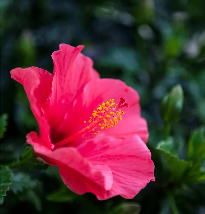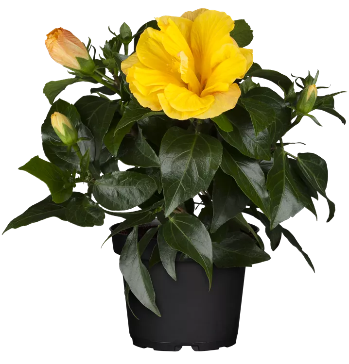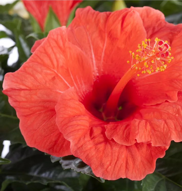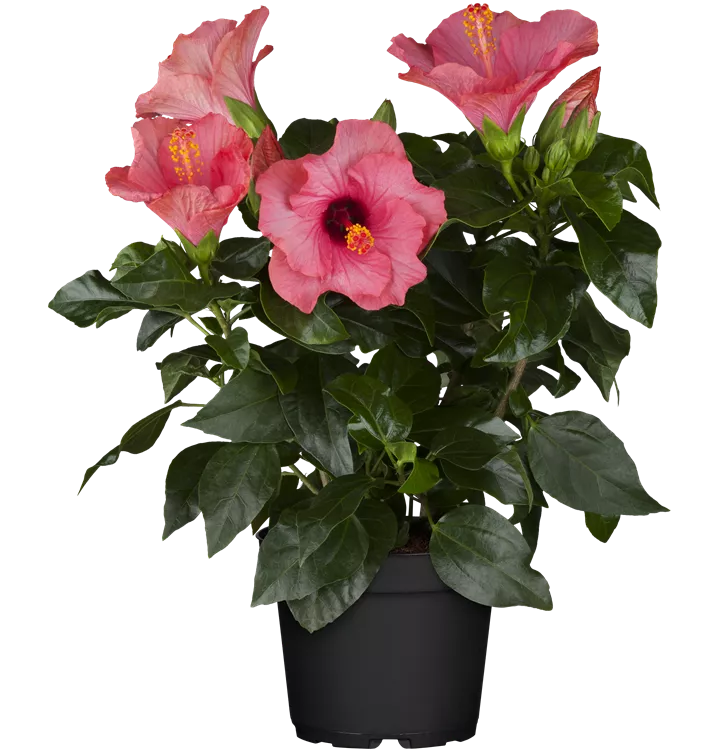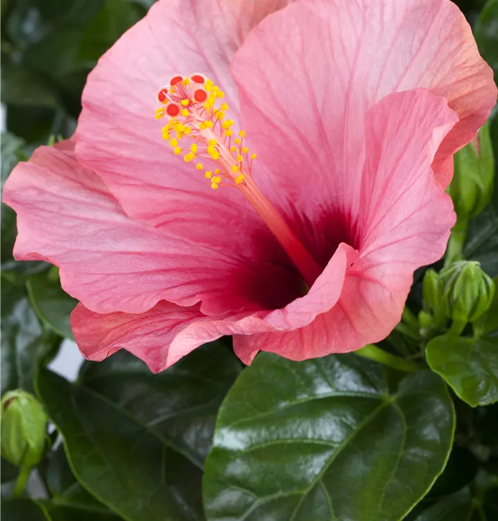 Der Chinesische Roseneibisch (Hibiscus rosa-sinensis) ist eine sehr beliebte, immergrüne Kübelpflanze. Seine dekorativen Blüten sind schalenförmig und erscheinen von Juni bis Oktober. Die dunkelgrünen Blätter sind eiförmig. Der Standort sollte möglichst sonnig bis halbschattig und geschützt sein. Eine durchlässige und nährstoffreiche Erde ist dabei ideal. Bei günstigen Bedingungen erreicht der Chinesische Roseneibisch eine Höhe von ca. 50 cm und wird bis zu 50 cm breit.