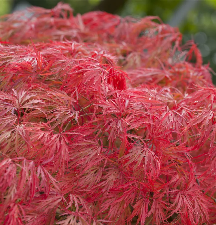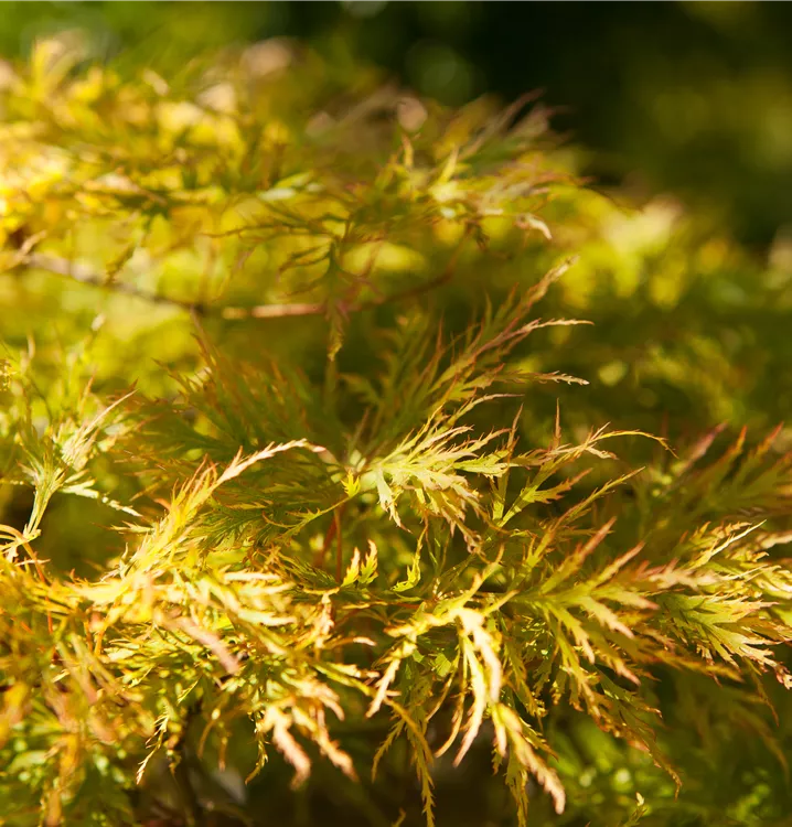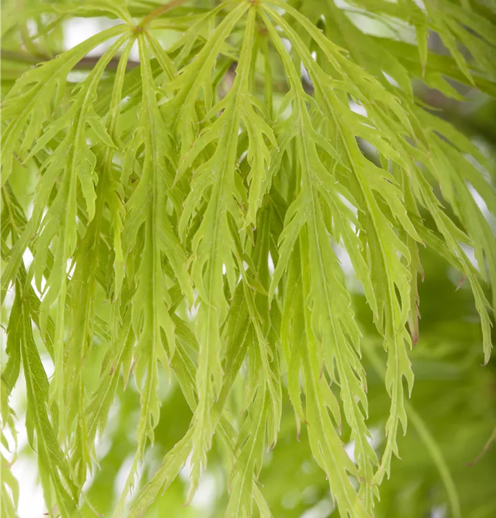 Hoher Blattschmuckwert. Die sommergrünen Blätter des Grünen Schlitzahorns 'Dissectum' sind hellgrün, tief geschlitzt, gegenständig. Diese sind etwa 6 - 11 cm groß. Grüner Schlitzahorn 'Dissectum' zeigt sich leuchtend orange-rot im Herbst.