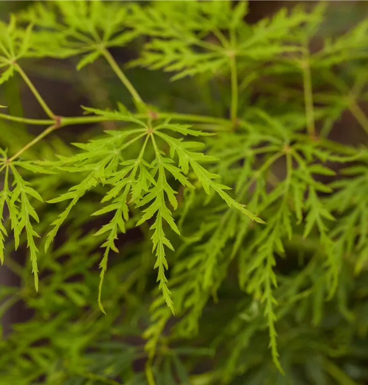 Der Grüne Schlitzahorn 'Dissectum' (Acer palmatum) ist ein schirmförmiger, überhängender, sommergrüner Strauch mit dekorativen, tief geschlitzten, hellgrünen Blättern. Zudem trägt er im Mai purpurrote, in Trauben angeordnete Blüten. Aus diesen gehen rote Flügelfrüchte hervor. An einem sonnigen bis halbschattigen Standort mit durchlässigem, lockerem Boden erreicht er gewöhnlich eine Höhe von ca. 2 m und wird ca. 3 m breit.