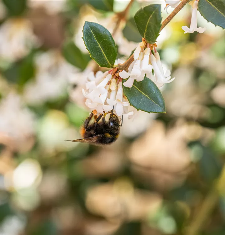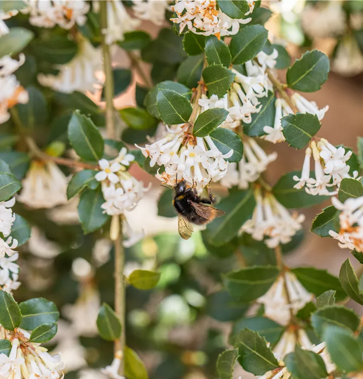 Die Burkwoods Duftblüte (Osmanthus burkwoodii) ist ein buschiger, breiter Großstrauch, der weiße Blüten mit einem starken Duft hervorbringt. Sie erscheinen von April bis Mai. Zudem trägt die Burkwoods Duftblüte, glänzende, eiförmige, dunkelgrüne Blätter. An einem halbschattigen bis schattigen, windgeschützten Standort mit durchlässigem, humosem Boden erreicht sie gewöhnlich eine Höhe von ca. 5 m und wird ca. 5 m breit.