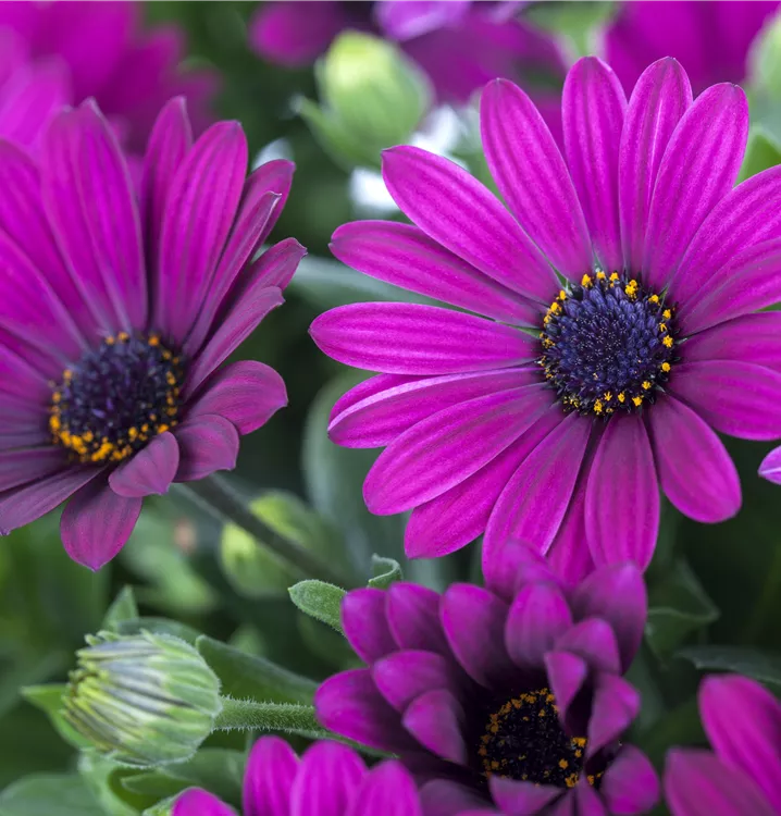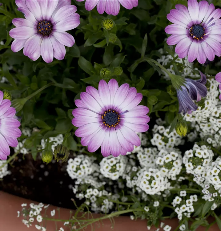 Das Kapkörbchen (Osteospermum ecklonis) ist eine beliebte, pflegeleichte Pflanze für den Balkon, die während der gesamten Saison unzählige weiße, gelbe, lilafarbene oder rosafarbene Blüten bildet. Ein sonniger Standort und ein durchlässiges Substrat werden bevorzugt.
