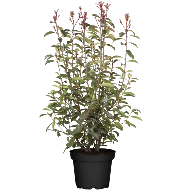 Die immergrünen Blätter der Glanzmispel 'Little Red Robin' sind dunkelgrün, lanzettlich, glänzend. Roter Austrieb.