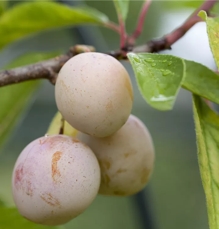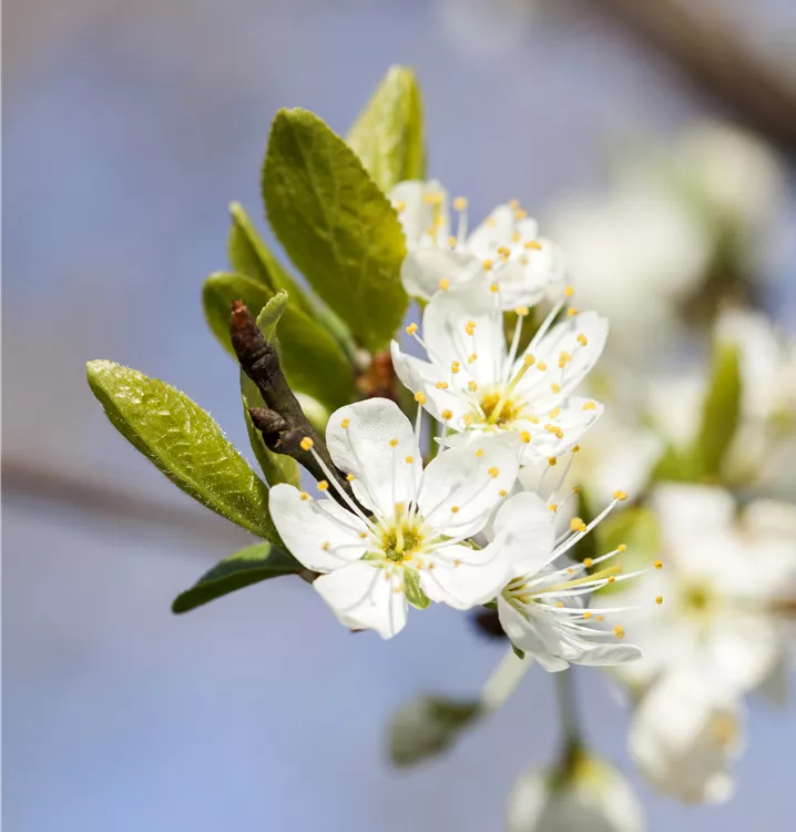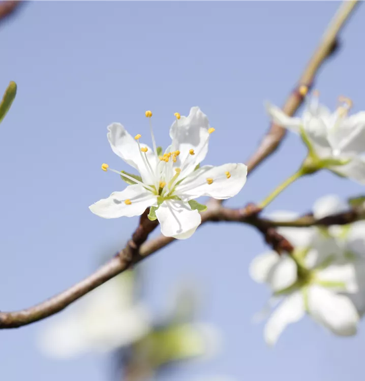 Die Mirabelle (Prunus domestica) bildet orangegelbe Früchte. Sie haben einen süß-säuerlichen Geschmack. Für eine ertragreiche Ernte ab August schaffen durchlässiger, humoser Boden und ein sonniger bis halbschattiger Standort optimale Bedingungen. Ihre weißen Blüten sind eine schöne Erscheinung. Die Mirabelle wird mit ihrem aufrechten und schlanken Wuchs etwa 10 m hoch und 5 m breit.