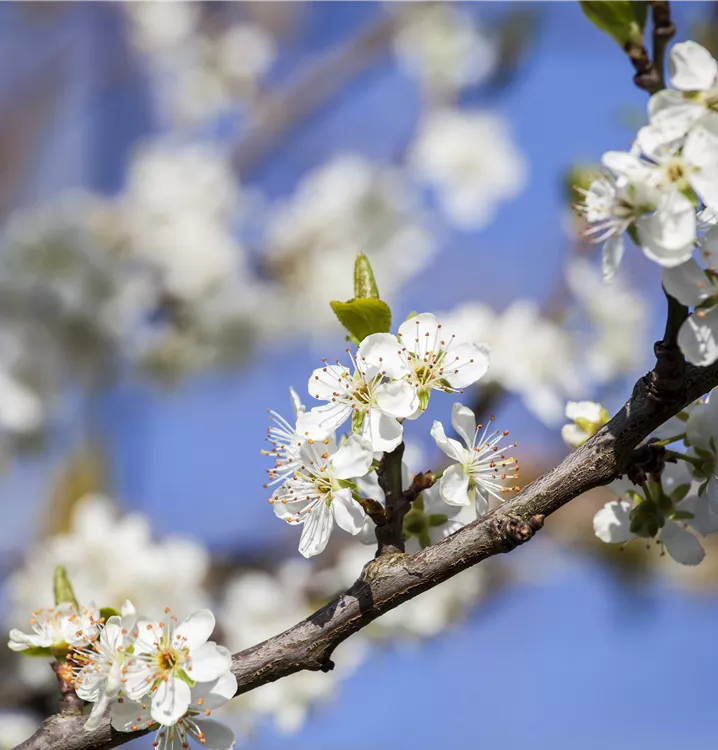 Prunus domestica subsp. syriaca bildet weiße Blüten ab März.
