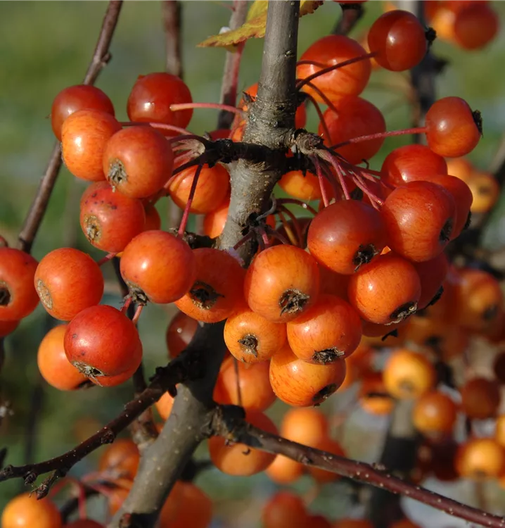 Besonders dekorativ sind die orangegelben, runden Früchte von Malus 'Pom Zai'®. Diese erscheinen ab September und sind klein.