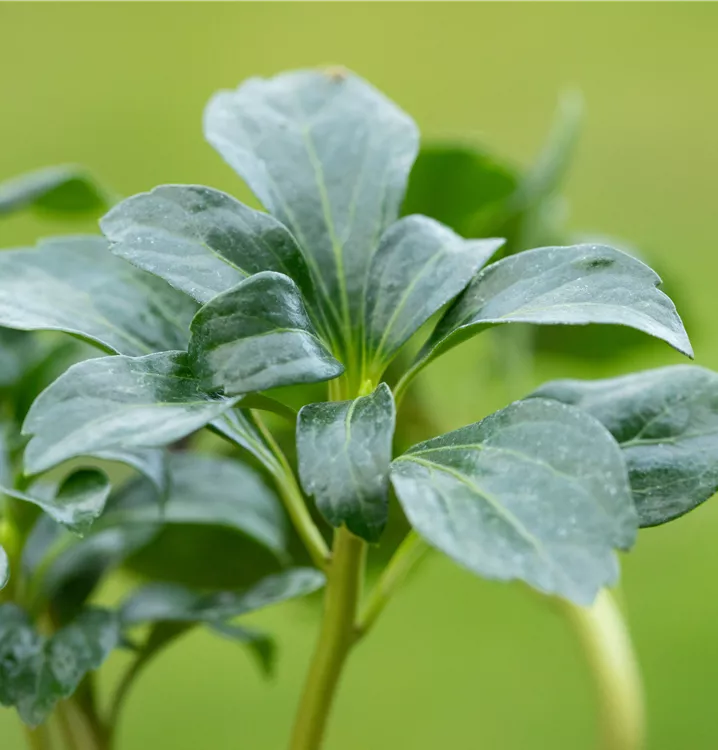 Die immergrünen Blätter des Dickmännchens 'Green Sheen'® sind dunkelgrün, glänzend, eiförmig, quirlständig, gezähnt. Diese sind etwa 6 - 10 cm groß.