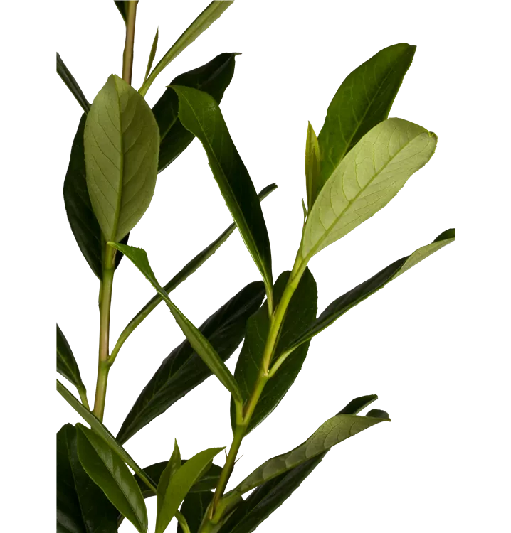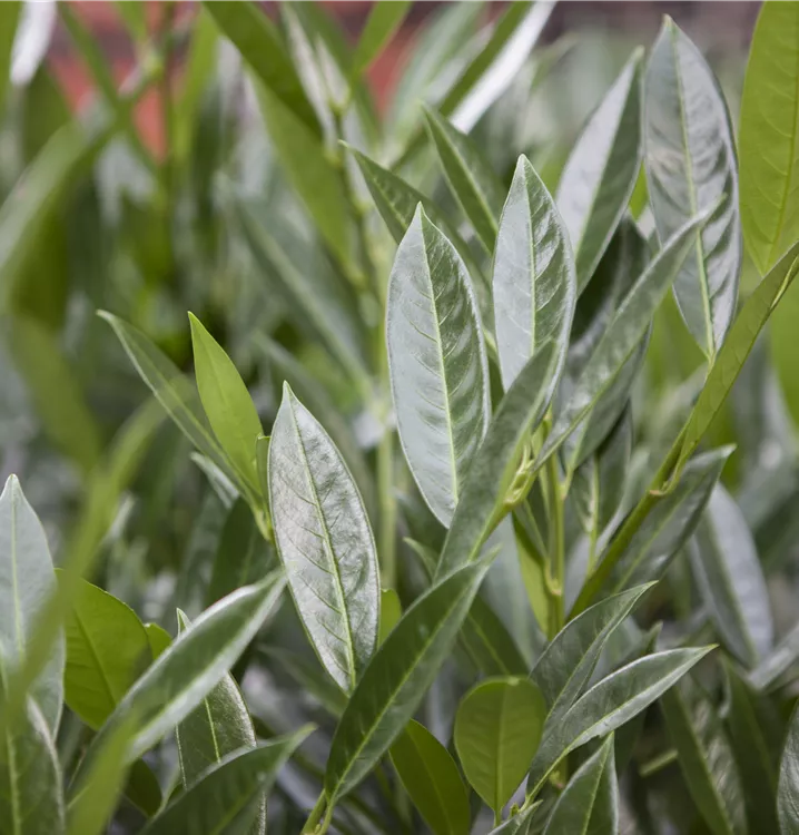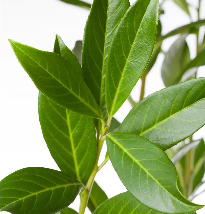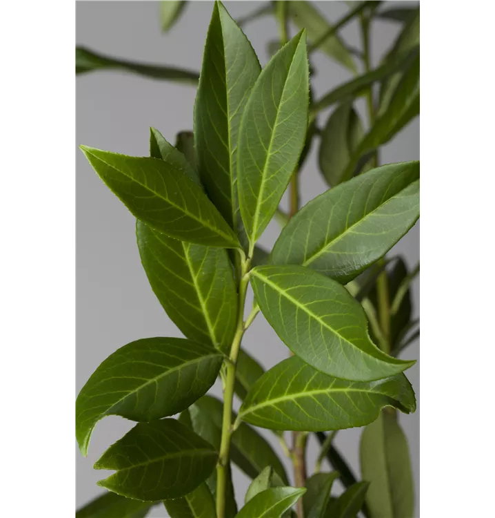 Die immergrünen Blätter der Kaukasische Lorbeerkirsche 'Caucasica' sind mittelgrün, eiförmig, glänzend, wechselständig.