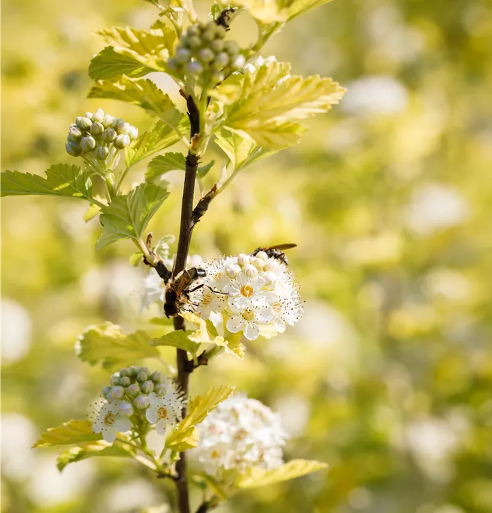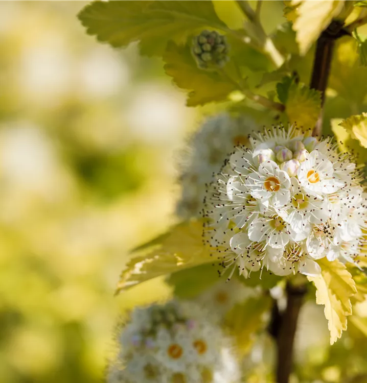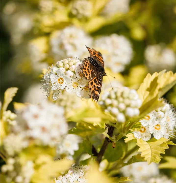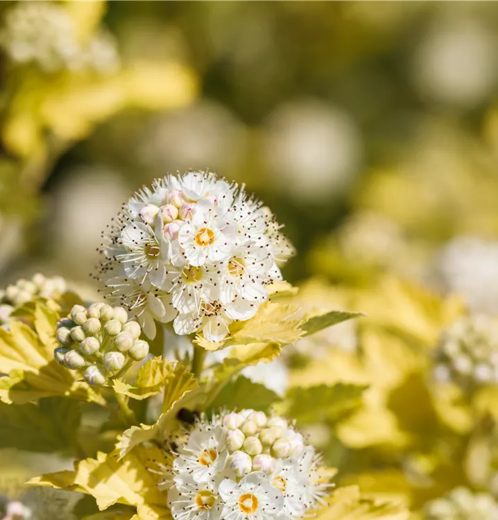 Die Fasanenspiere 'Dart´s Gold' (Physocarpus opulifolius) ist ein aufrechter, sommergrüner Strauch mit dekorativen, eiförmigen, grüngelben Blättern. Zudem trägt sie von Juni bis Juli weiße, in Doldentrauben angeordnete Blüten. An einem sonnigen bis halbschattigen Standort mit durchlässigem Boden erreicht sie gewöhnlich eine Höhe von ca. 2,5 m und wird ca. 2,5 m breit.