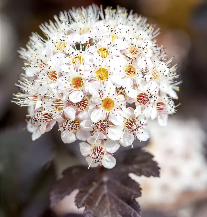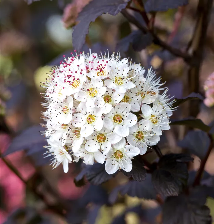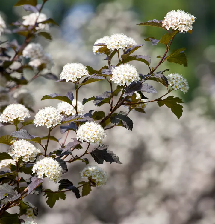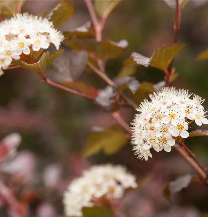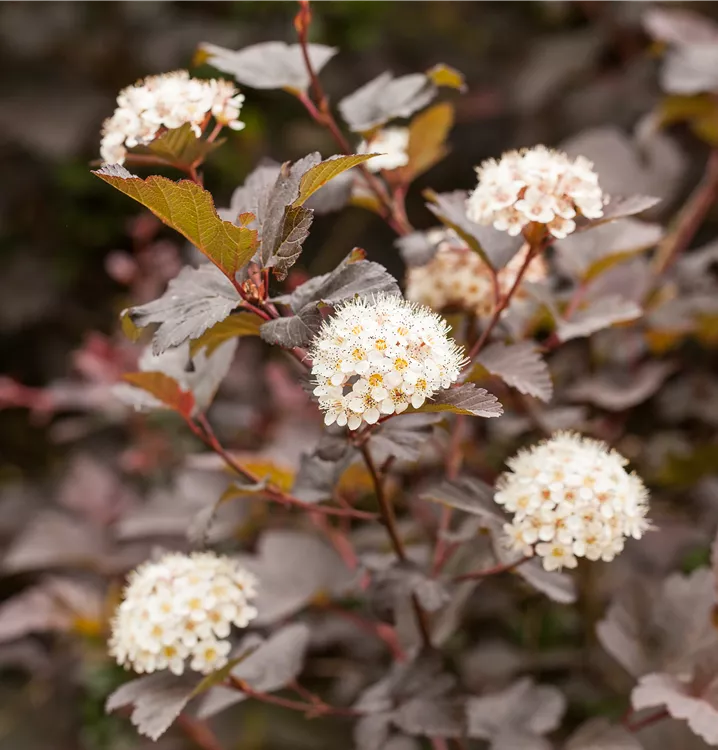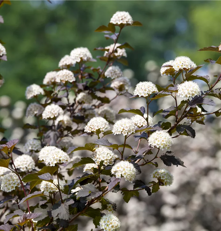Die Fasanenspiere 'Diabolo'® (Physocarpus opulifolius) ist ein buschiger, aufrechter, sommergrüner Strauch mit dekorativen, eiförmigen, dunkelroten Blättern. Zudem trägt sie von Mai bis Juni weiße, in Doldentrauben angeordnete Blüten. Aus diesen gehen ab September rote Früchte hervor. An einem sonnigen bis halbschattigen Standort mit durchlässigem Boden erreicht sie gewöhnlich eine Höhe von ca. 3 m und wird ca. 3 m breit.