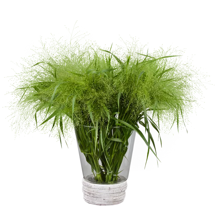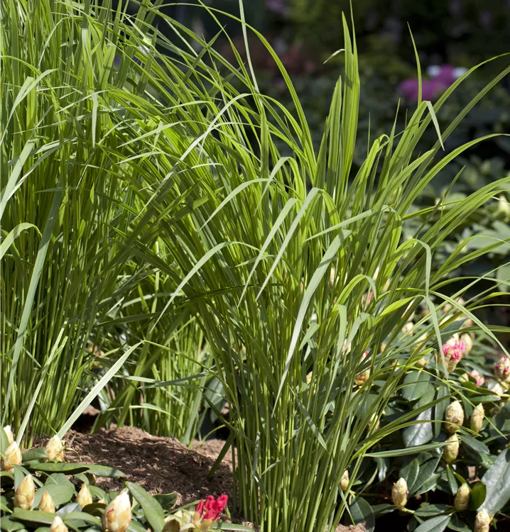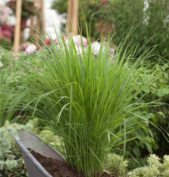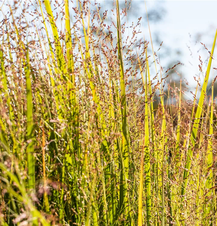 Die Ruten-Hirse (Panicum virgatum) ist mit ihrer mittelgrünen Blattfärbung ein dekoratives Gestaltungselement im Garten, welches mit seinem horstbildenden und trichterförmigen Wuchs aber ebenso Kübel auf Balkon oder Terrasse ziert. Die grünen Blütenrispen schmücken diese Gras ab Sommer. An einem sonnigen Standort mit einem möglichst durchlässigen, humosen, lockeren Boden fühlt sie sich am wohlsten. Bei günstigen Bedingungen erreicht dieses winterharte Gras eine Höhe von ca. 2,5 m und wird bis zu 1 m breit.