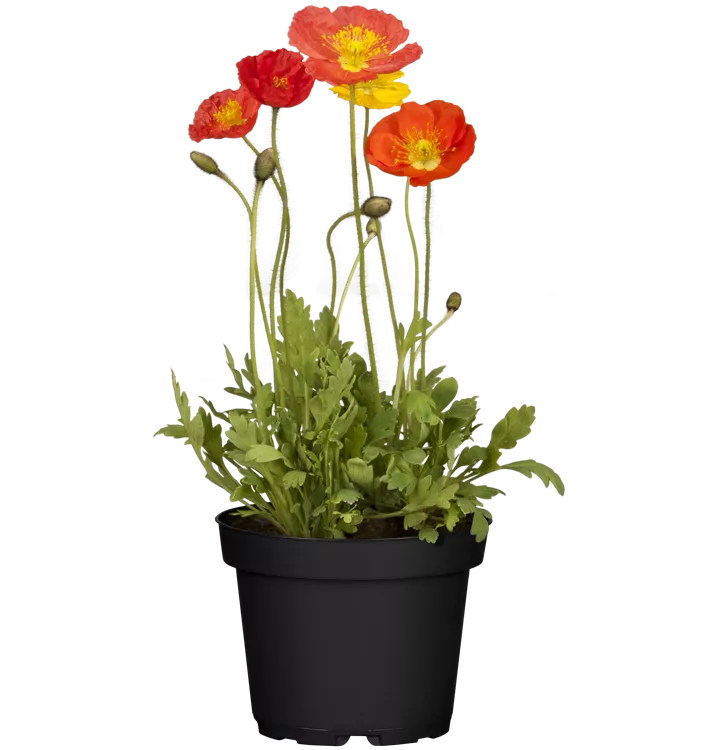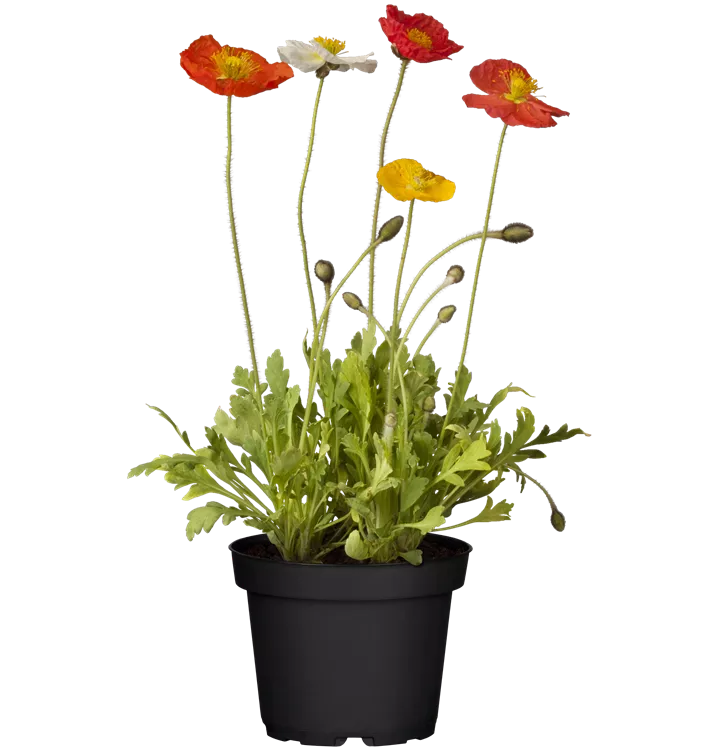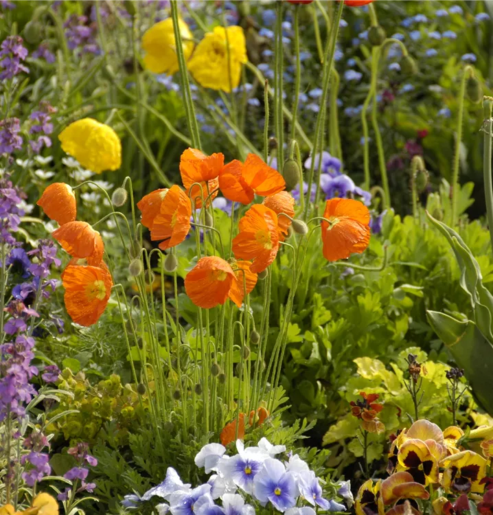Papaver nudicaule bildet schalenförmige, rote, orangefarbene, gelbe, weiße Blüten ab Mai.