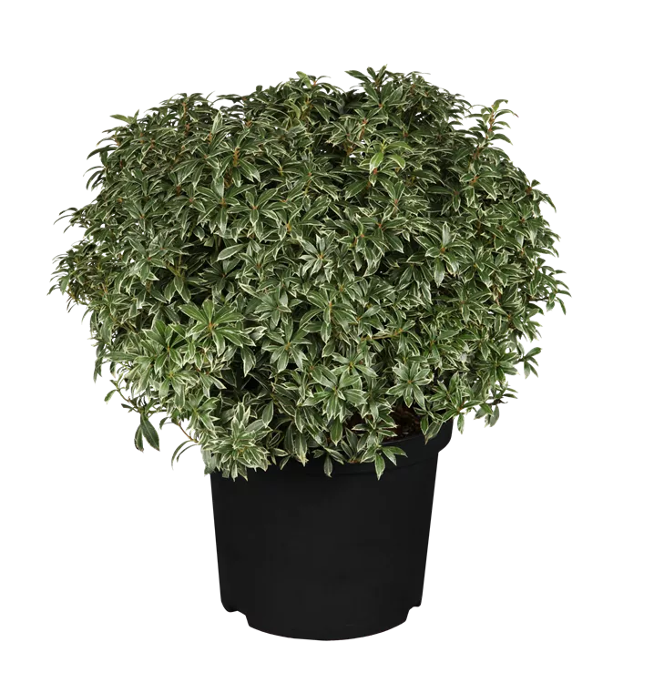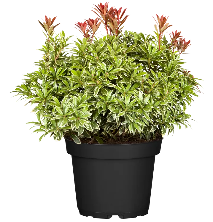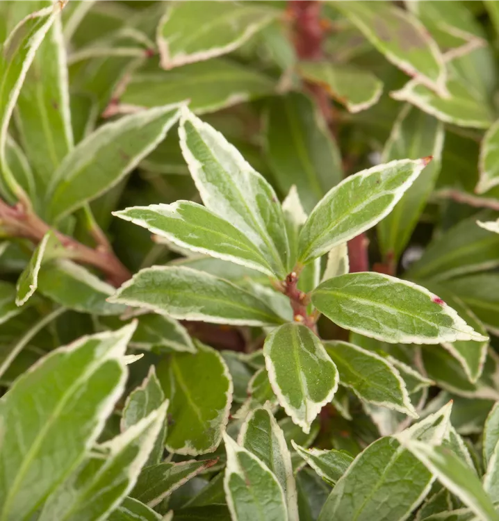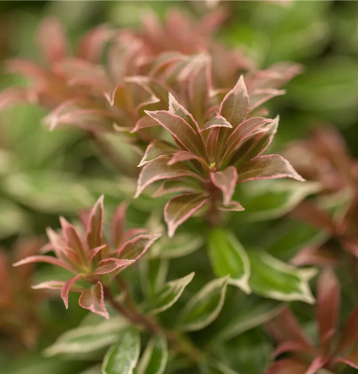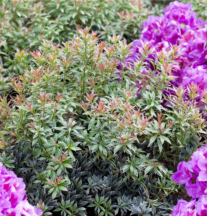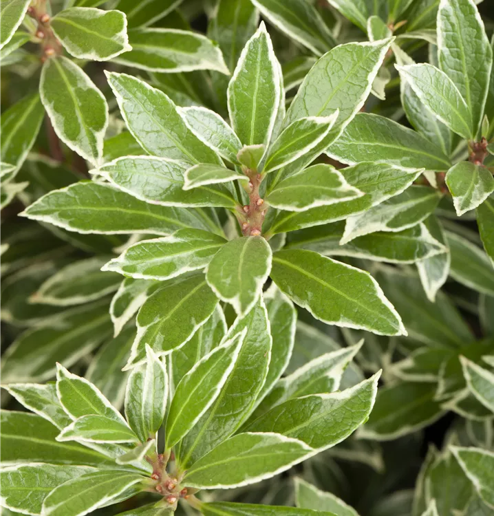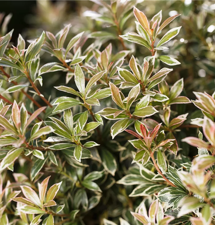 Das Schattenglöckchen 'Little Heath' (Pieris japonica) ist ein buschiger, breiter, immergrüner Kleinstrauch mit dekorativen, glänzenden, lanzettlichen, dunkelgrünen Blättern mit einem weißen Rand. Der rosa-rote Austrieb ist ebenso ein interessanter Anblick. Zudem trägt es von April bis Mai weiße, becherförmige, in Rispen angeordnete Blüten. Aus diesen gehen ab August hellbraune, runde Früchte hervor. An einem halbschattigen bis schattigen, windgeschützten Standort mit humosem, nährstoffreichem Boden erreicht es gewöhnlich eine Höhe von ca. 1 m und wird ca. 1 m breit.
