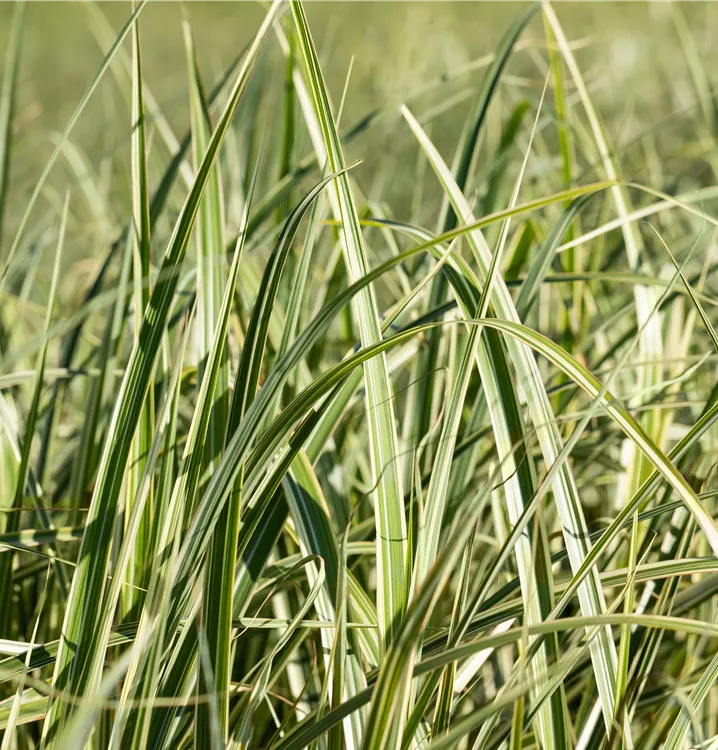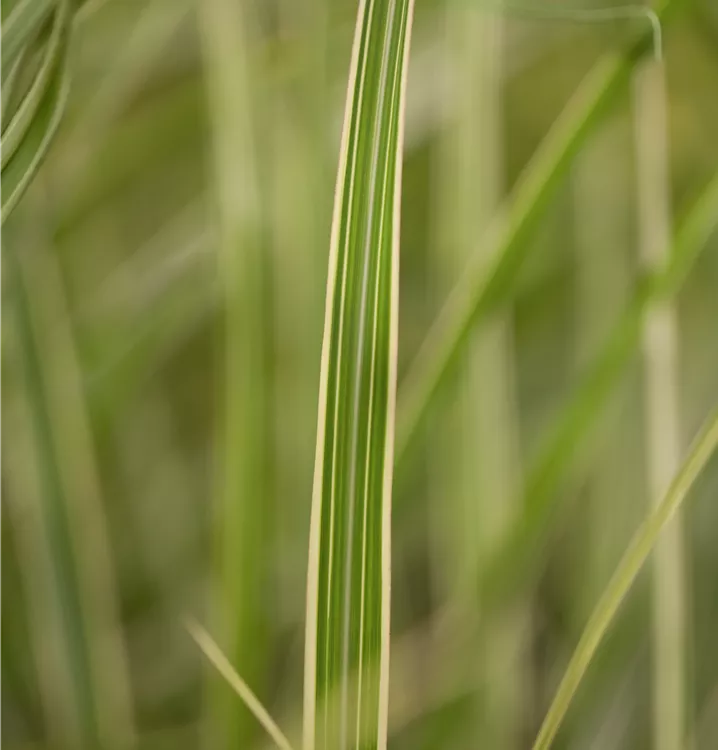 Hoher Blattschmuckwert. Die sommergrünen Blätter des Garten-Chinaschilfs 'Variegatus' sind grün-weiß, lineal.