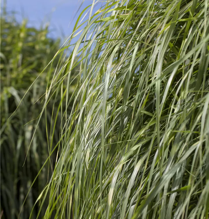 Hoher Blattschmuckwert. Die sommergrünen Blätter des Garten-Chinaschilfs 'Zebrinus' sind gelb-grün, lineal.