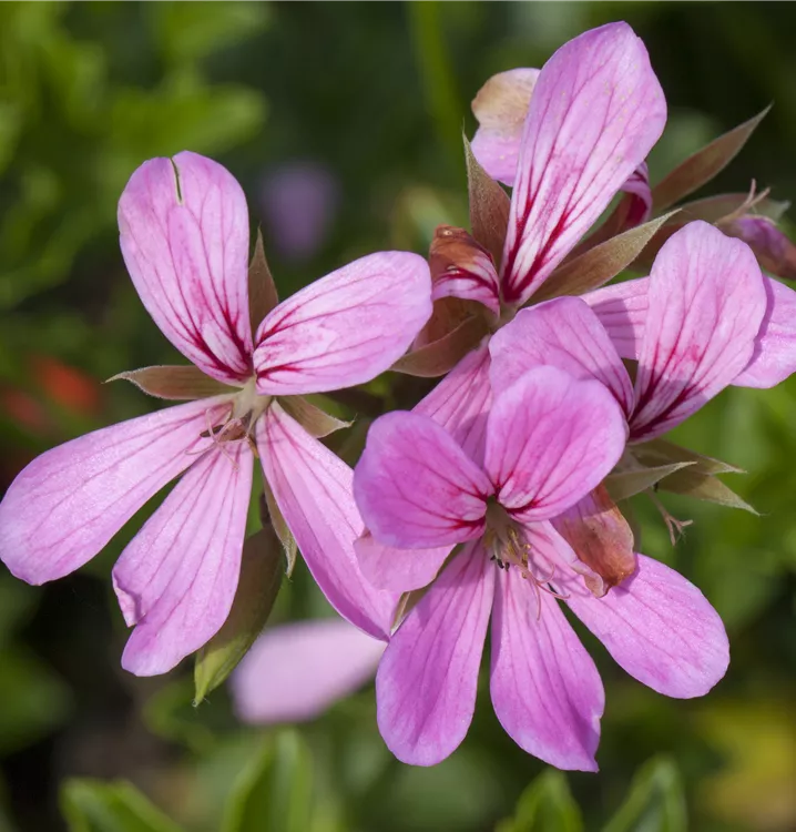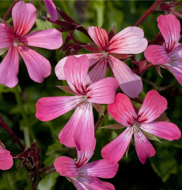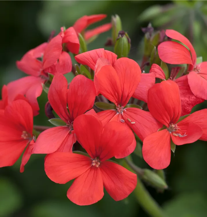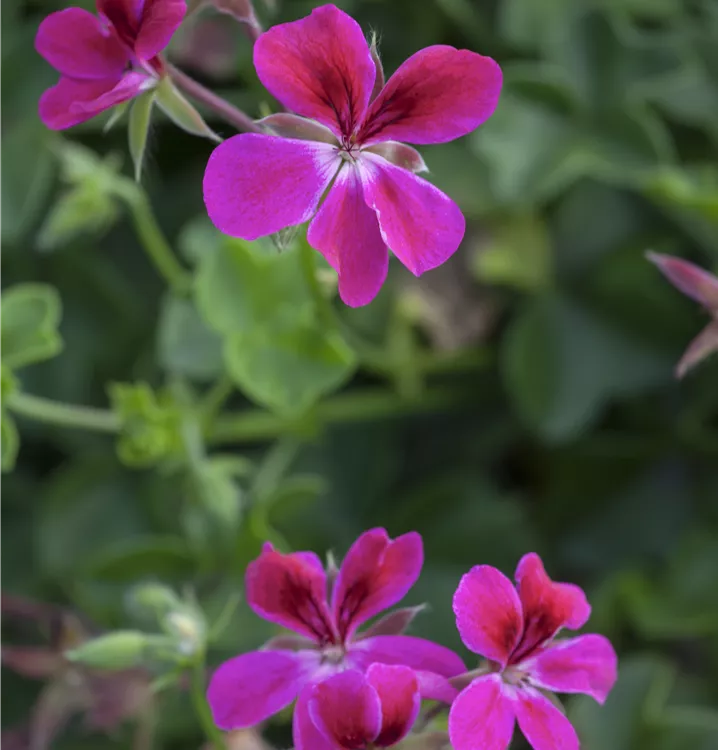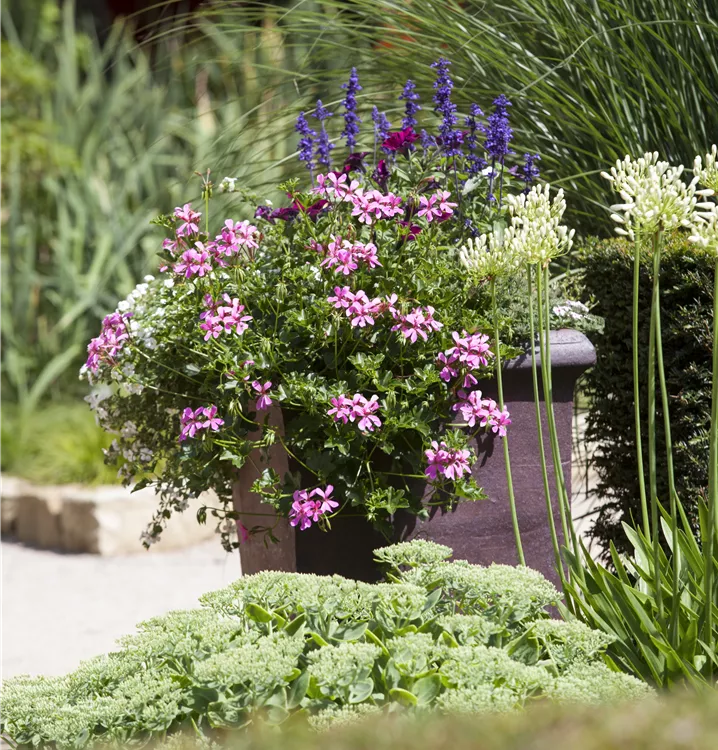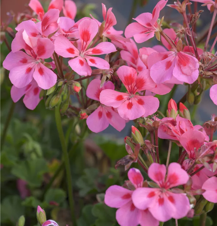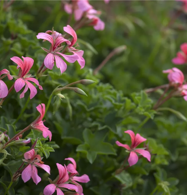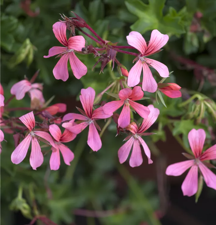 Die Hängegeranie (Pelargonium peltatum) ist eine beliebte Pflanze für den Balkon, die während der gesamten Saison unzählige hellrosafarbene, rosafarbene, rosarote oder rote Blüten bildet. Die mittelgrünen Blätter sind rundlich. Ein sonniger bis halbschattiger Standort und ein durchlässiges Substrat werden bevorzugt. Mit ihrem hängenden Wuchs passt die Hängegeranie besonders gut in Blumenampeln und hängende Pflanzkörbe.