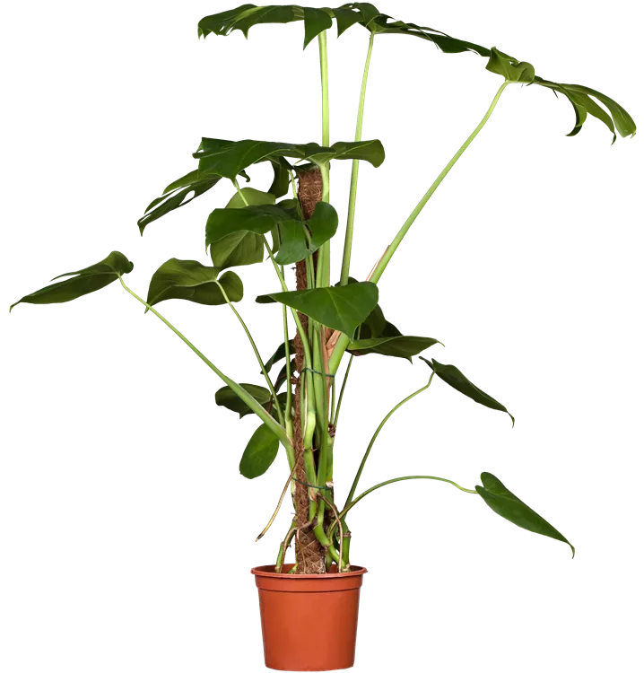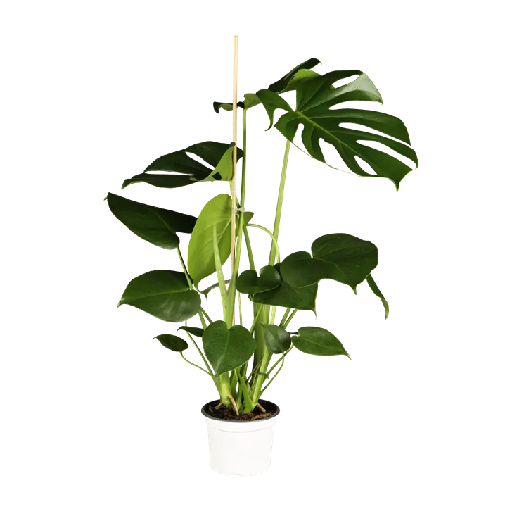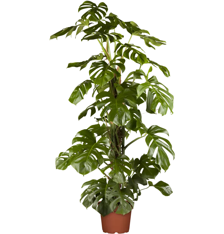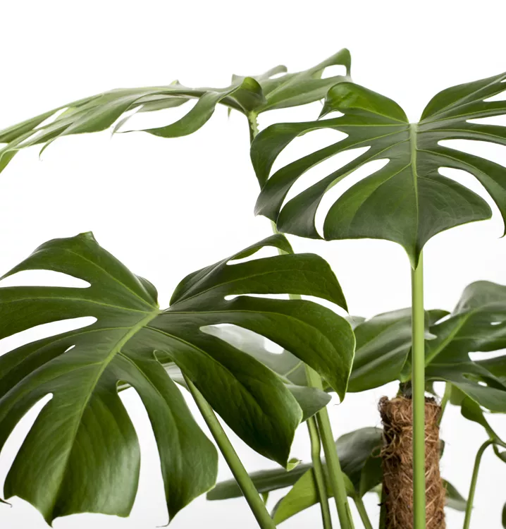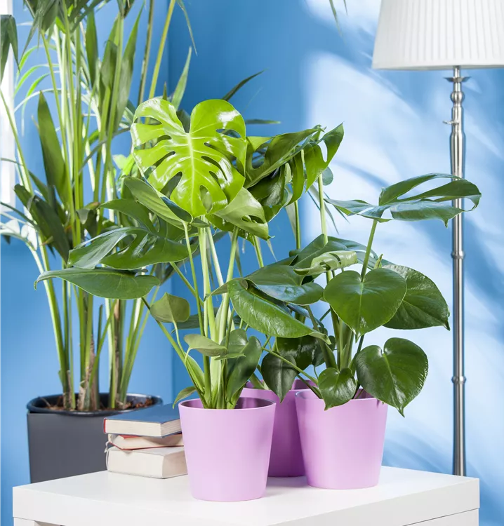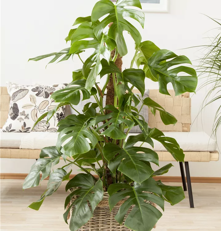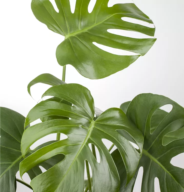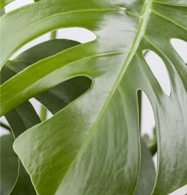Das Fensterblatt (Monstera deliciosa) ist eine Pflanze mit dekorativen, glänzenden, löchrigen, dunkelgrünen Blättern. Sie sind herzförmig und gebuchtet. Diese rankende und ausladende Pflanze gedeiht am besten an einem sonnigen bis halbschattigen Standort.