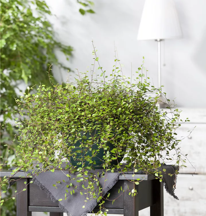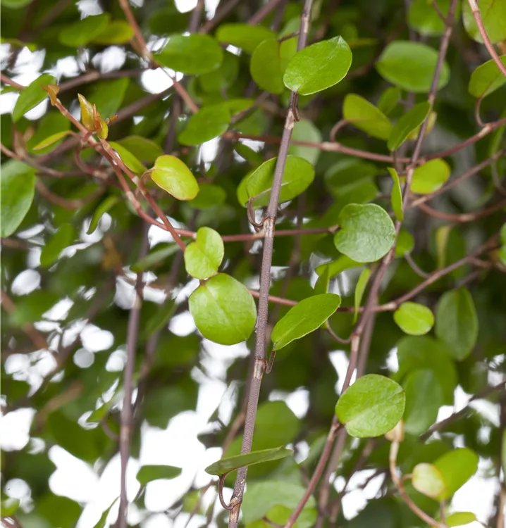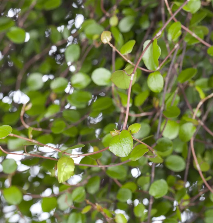 Der Drahtwein (Muehlenbeckia complexa) ist eine beliebte Pflanze für den Balkon. Die dunkelgrünen Blätter sind rundlich. Ein sonniger bis schattiger Standort und ein durchlässiges Substrat werden bevorzugt. Mit seinem kriechenden Wuchs passt der Drahtwein besonders gut in Blumenampeln und hängende Pflanzkörbe.
