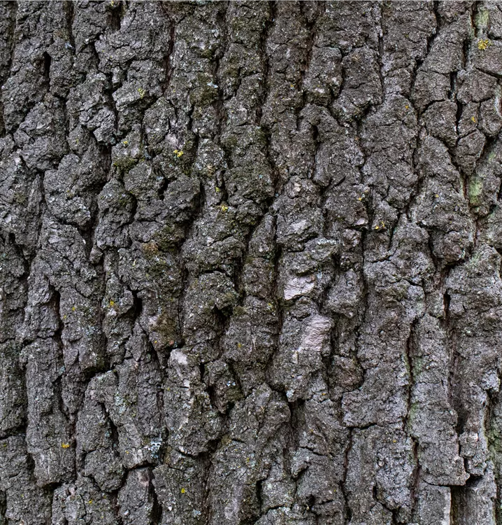 Dunkelgrau, tiefrissige, längsgefurchte Rinde macht diese Pflanze zu einem Blickfang in jedem Garten.