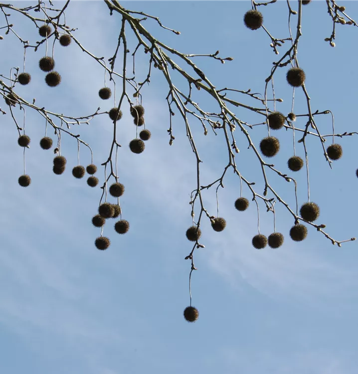Besonders dekorativ sind die braun-gelben, runden Früchte von Platanus x hispanica. Diese erscheinen ab Oktober. Haften sehr lange.