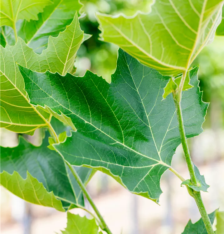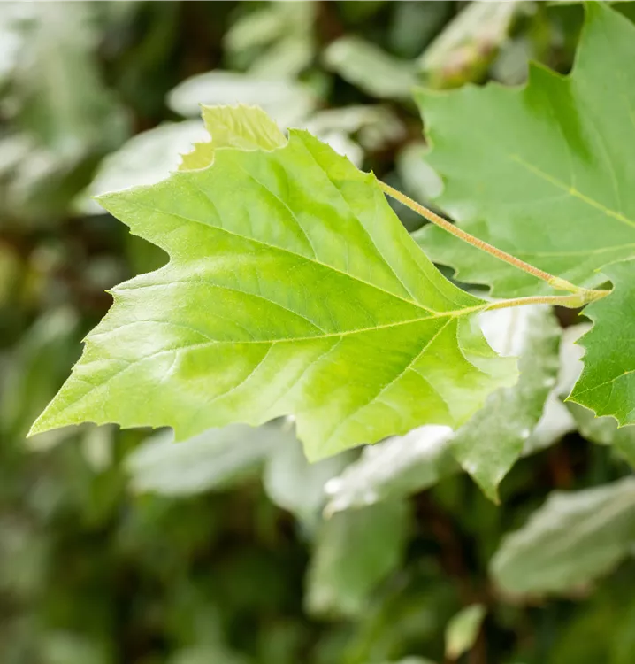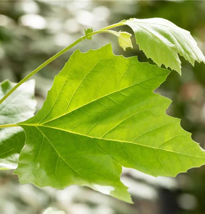 Die sommergrünen Blätter der Ahornblättrige Platane sind mittelgrün, dreieckig, ledrig, wechselständig, gelappt. Diese sind etwa 12 - 25 cm groß. Ahornblättrige Platane zeigt sich leuchtend bernsteingelb im Herbst. Lange haftend.