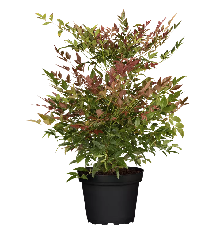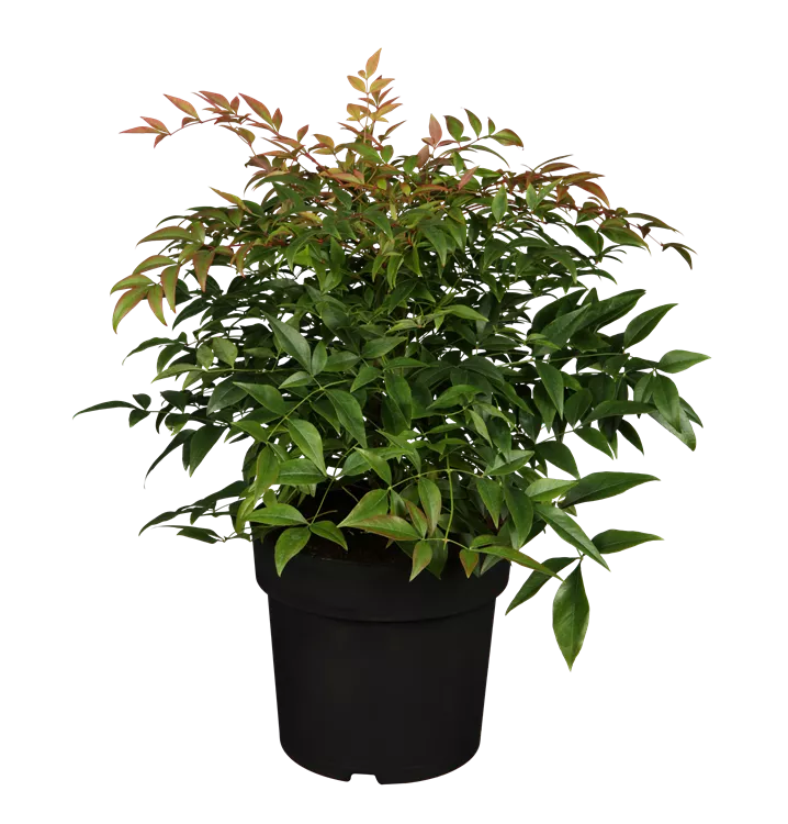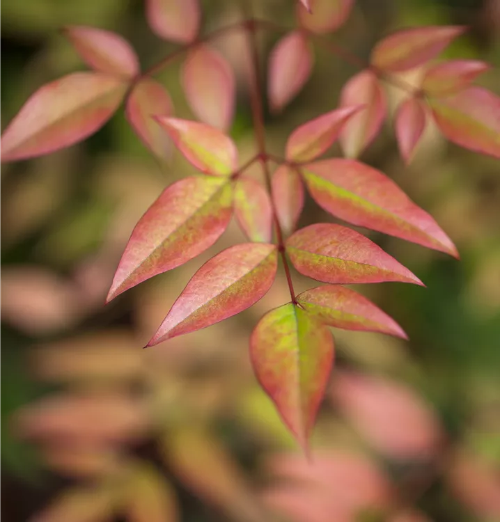 Die immergrünen Blätter des Heiligen Bambus sind grün-rot, lanzettlich. Heiliger Bambus zeigt sich leuchtend purpurrot im Herbst.