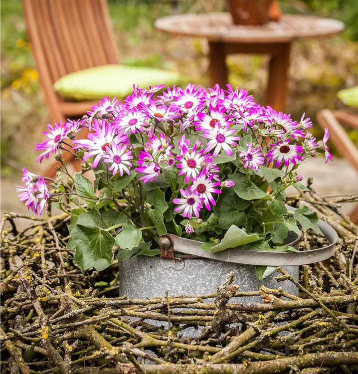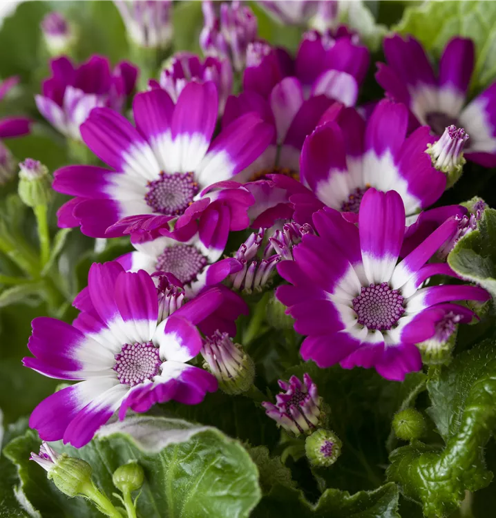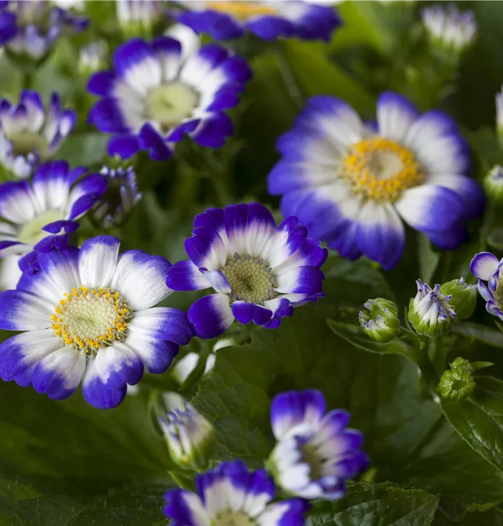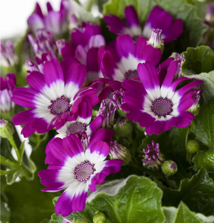 Die Aschenblume (Pericallis cruentus) ist eine beliebte, pflegeleichte Pflanze für den Balkon, die während der gesamten Saison unzählige weiße, rosafarbene, violette oder blaue Blüten bildet. Ein sonniger bis halbschattiger Standort und ein durchlässiges Substrat werden bevorzugt.