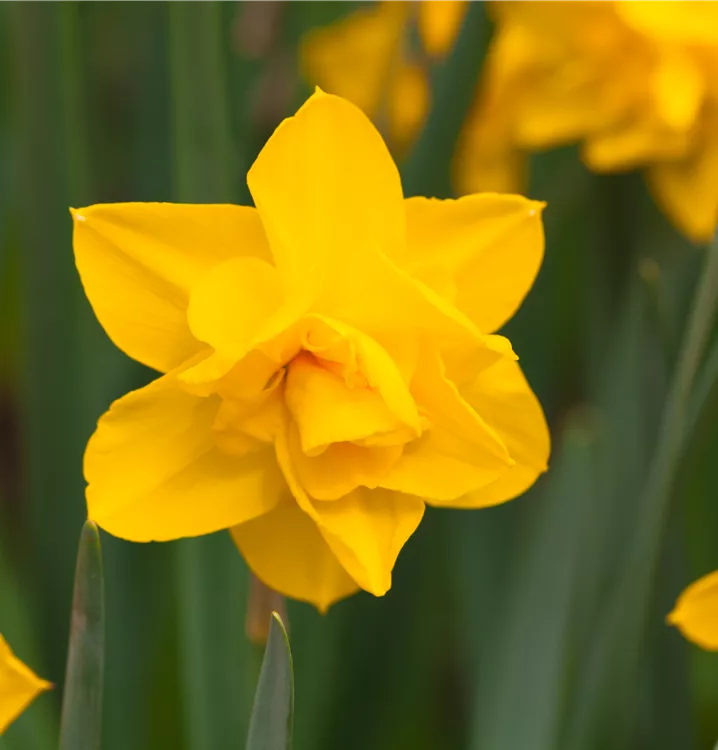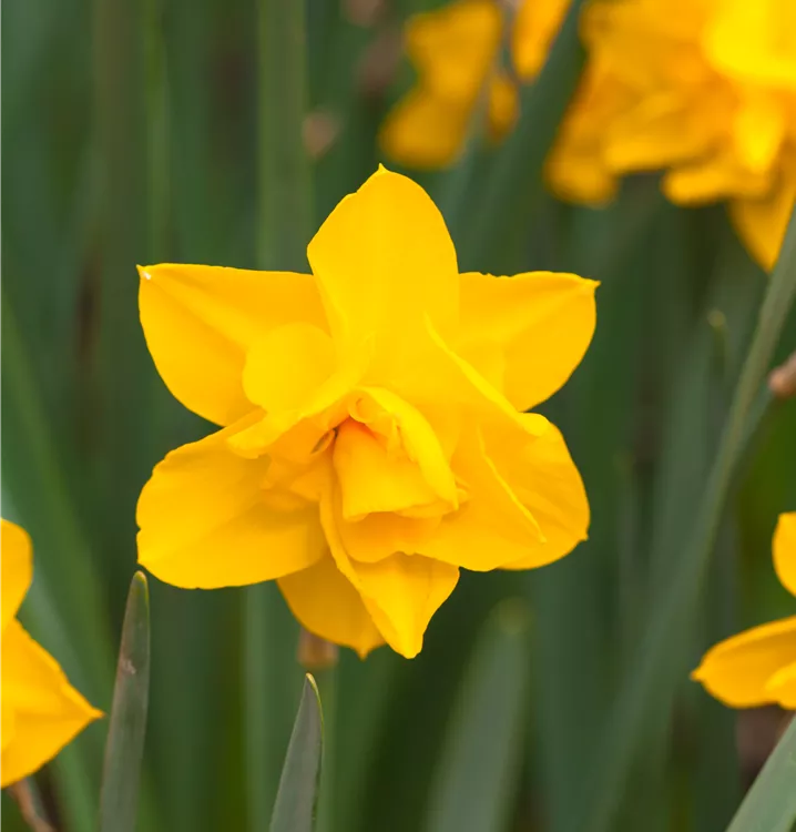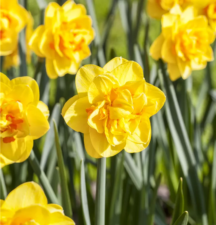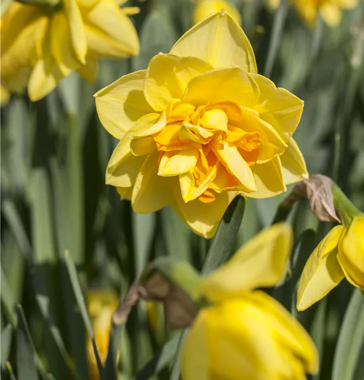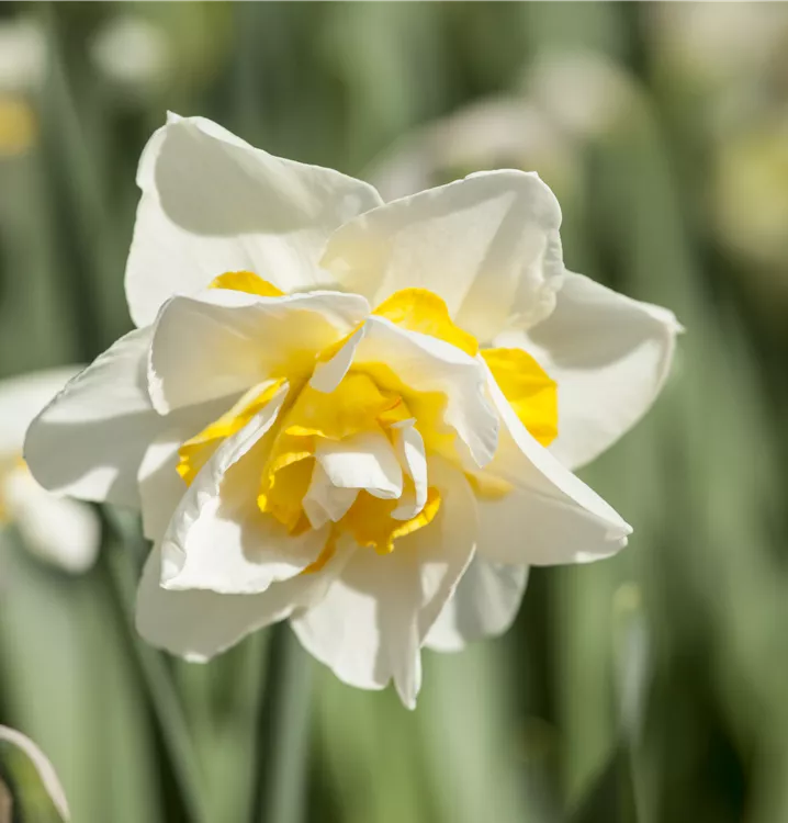 Die Gefüllte Narzisse (Narcissus) bringt ansehnliche, weiße, gelbe, orangefarbene, angenehm duftende, gefüllte Blüten im April hervor. Sie bevorzugt durchlässigen, lockeren, nährstoffreichen Boden in sonniger windgeschützter Lage. Die aufrechte Pflanze erreicht gewöhnlich eine Höhe von 20 - 40 cm und wird bis zu 15 cm breit.