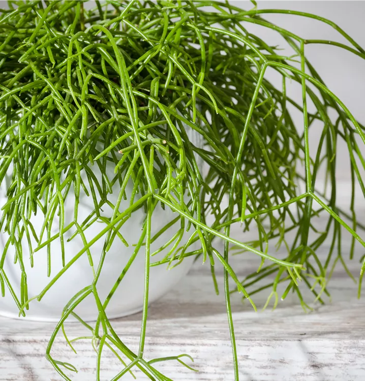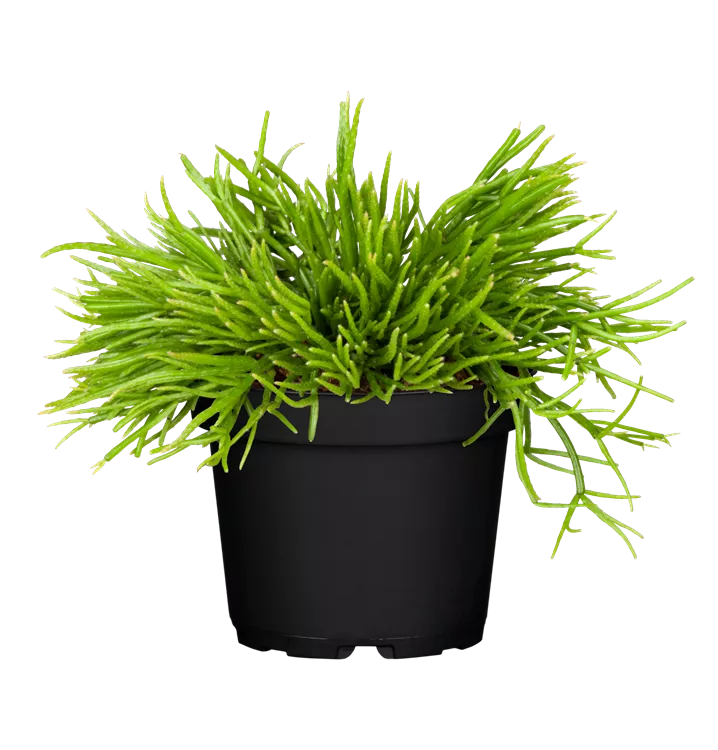 Die immergrünen Blätter des Binsenkaktuses sind hellgrün, dickfleischig.