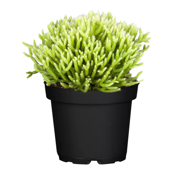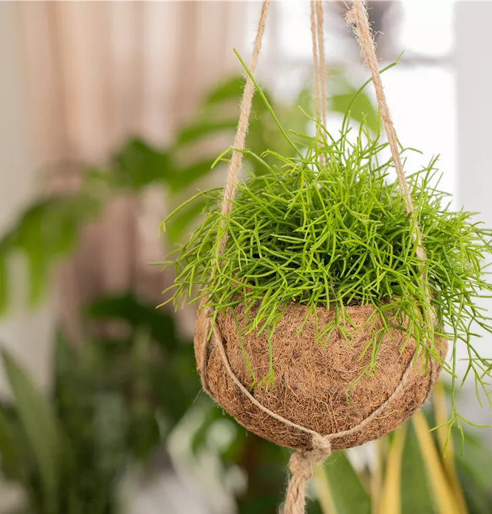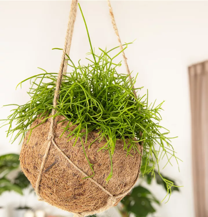 Der Binsenkaktus (Rhipsalis baccifera) ist eine Pflanze mit hellgrünen, dickfleischigen Blättern. Seine radförmigen Blüten sind weiß und erscheinen von April bis Juni. Diese überhängende Pflanze gedeiht am besten an einem halbschattigen Standort.
