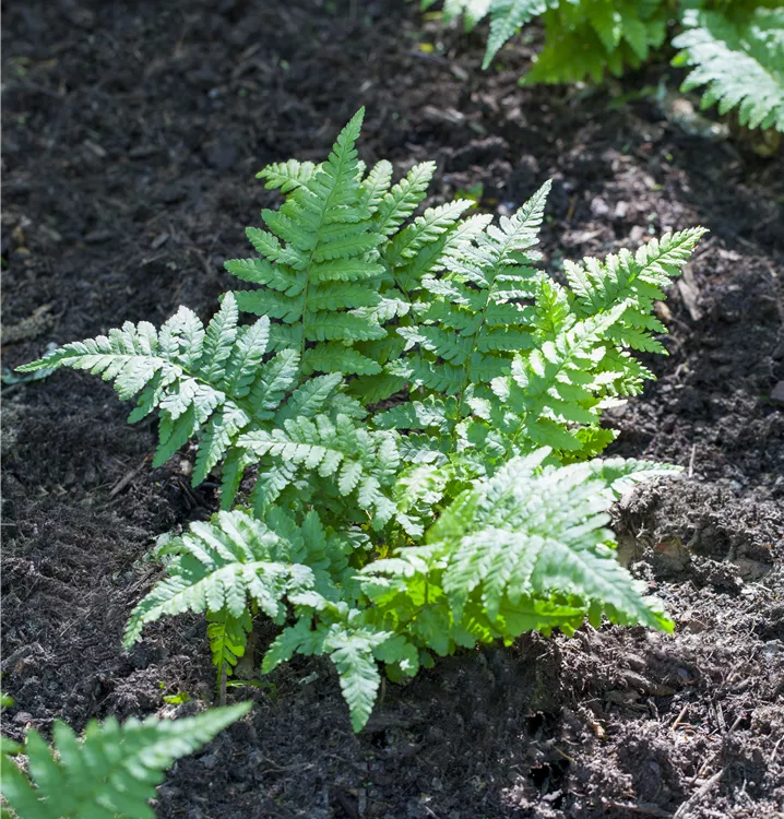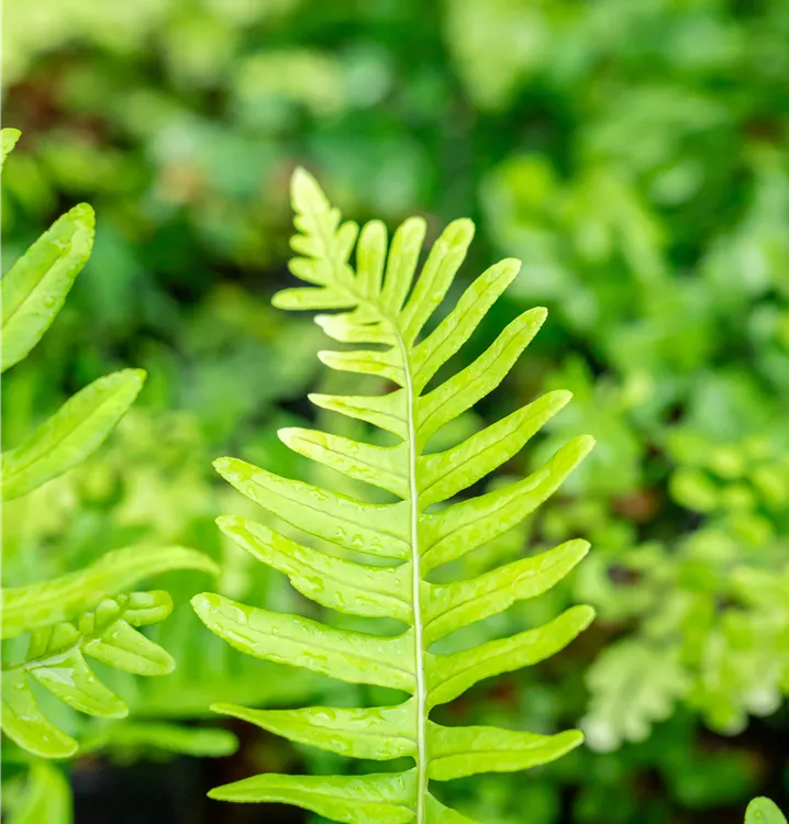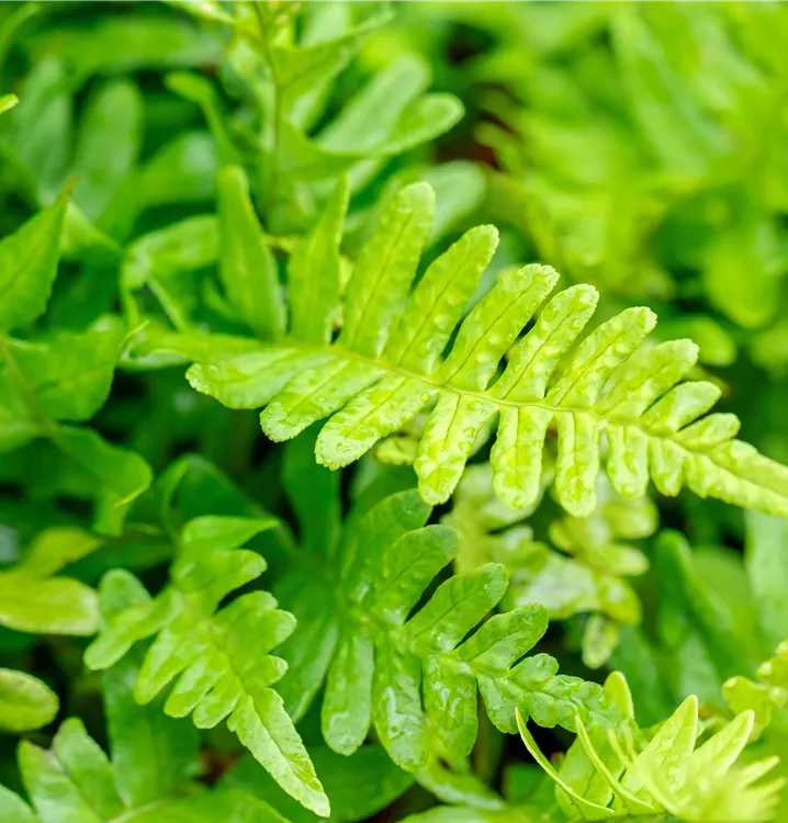 Der Gemeine Tüpfelfarn (Polypodium vulgare) ist mit seinen gefiederten, dunkelgrünen Blattwedeln ein dekoratives Gestaltungselement im Garten. An einem halbschattigen bis schattigen Standort mit einem möglichst durchlässigen, humosen, sauren Boden fühlt er sich am wohlsten. Bei günstigen Bedingungen erreicht dieser winterharte Farn eine Höhe von ca. 25 cm und wird bis zu 30 cm breit.