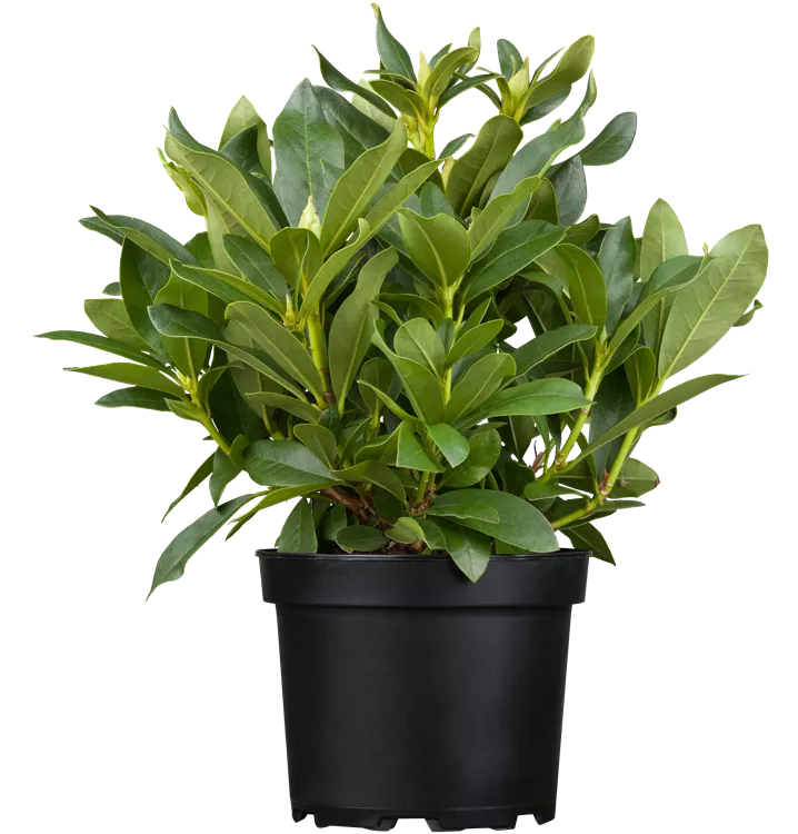 Der Großblumige Rhododendron ist immergrün und trägt dunkelgrüne lanzettliche Blätter.
