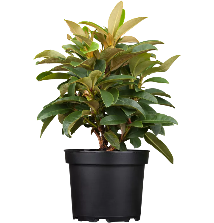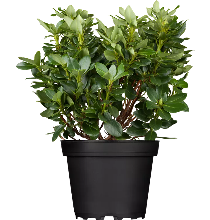 Sein immergrünes Laub ist dunkelgrün. Dieses aufrecht wachsende Gehölz erreicht gewöhnlich eine Höhe von 2 - 2,5 m und eine Breite von 1,5 bis 2,5 m. Ein halbschattiger (bis schattiger) Standort und ein humoser, kalkfreier Boden schaffen optimale Bedingungen für ein gesundes Wachstum. Der Großblumige Rhododendron ist gut frostverträglich.